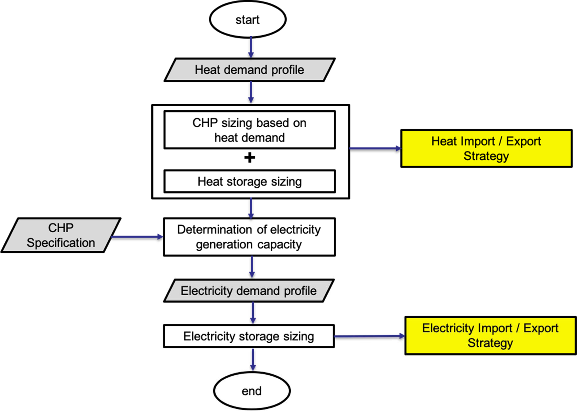 In this study, the sizing of a CHP unit, together with the operational management of surplus energy through the storage follows the design procedure given in Fig. 3. The capacity of heat generation, rather than electricity generation, is selected as the basis for the necessary capacity of a CHP unit, because the fulfillment of any deficit in electricity demand is relatively simpler and more straightforward than fulfilling deficits in the heat demand. Based on the heat demand data, the size of CHP systems is determined, together with the size of heat storage. Based on the given or selected RH-P from the CHP unit, the capacity of electricity generation can be determined, which is then applied for the electricity demand profile given. Calculating capacities of energy generation and storage, operating profiles for accumulation or usage of energy through storage can be obtained and strategies for energy export or import can be set up. It should be noted that the procedure show in Fig. 3 can be adjusted by putting the capacity of electricity generation as a basis for the design procedure.