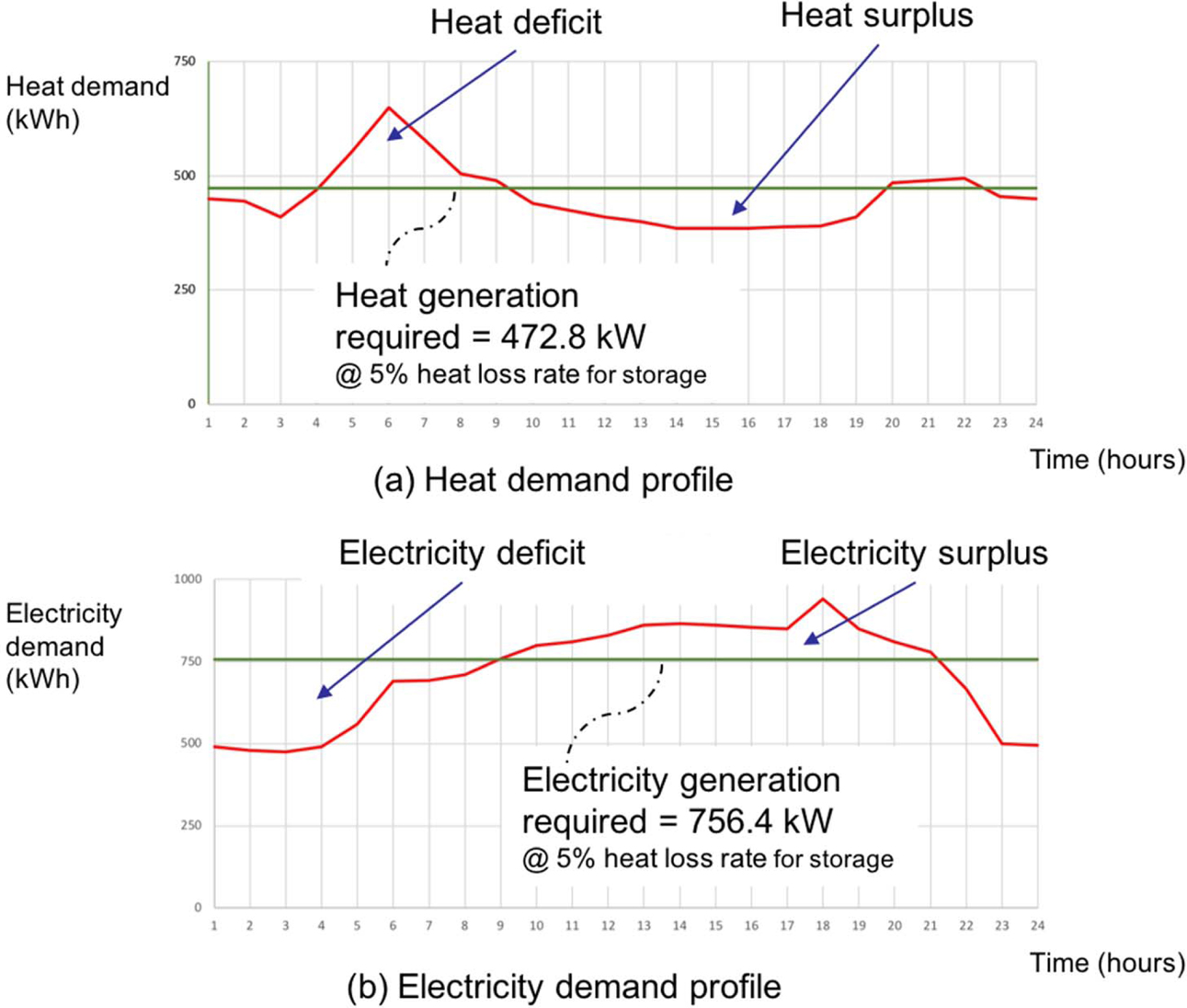 The capacity of heat generation given in Fig. 1 is in- dependently determined without considering the capacity of electricity generation, and vice versa. As shown in Fig. 2, the heat-to-power ratio for this example is 1.11. However, the CHP unit to be implemented is likely to have different RH-P other than 1.11. Difference of RH-P between a desired value and an actual one results in surplus or deficit in the energy storage, which should be systematically considered for the energy management of buildings.