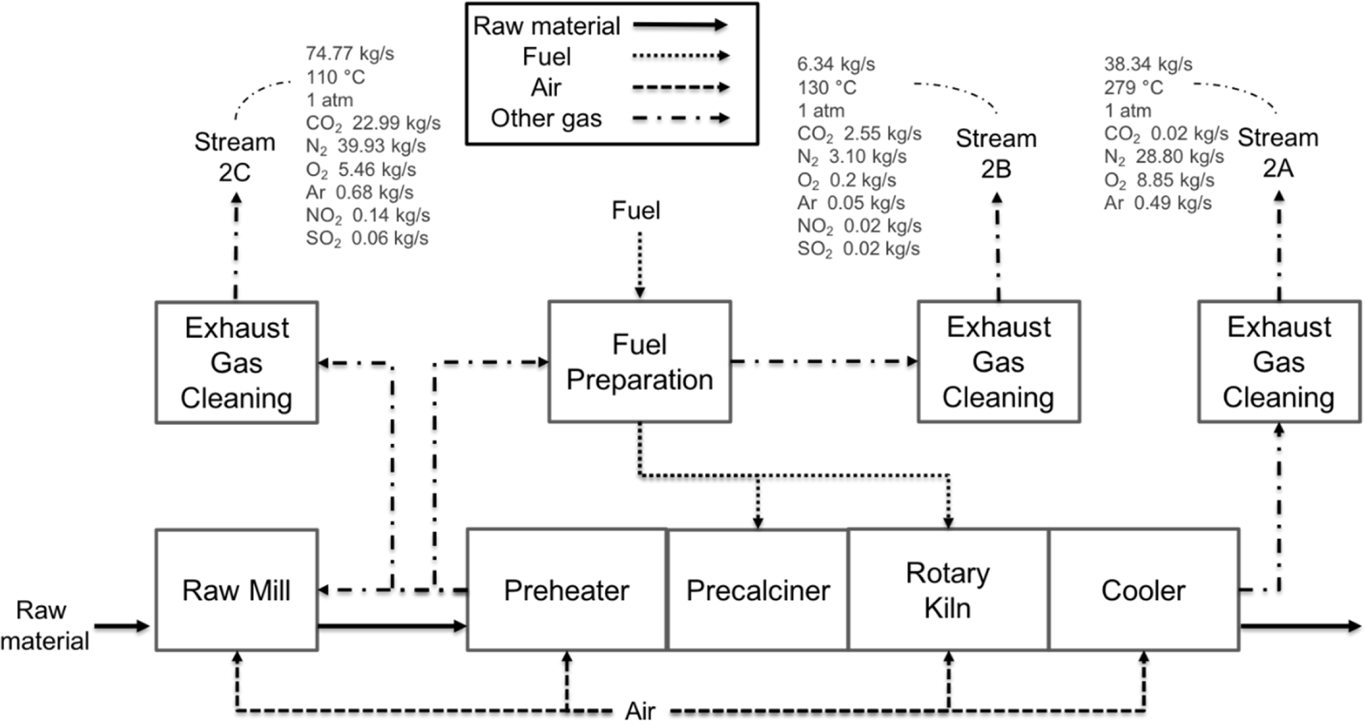 The industrial case studied is a cement plant produc- ing 1 million tons of cement per year, which is based on the study conducted by the International Energy Agency (IEA) [23]. Fig. 8 is a schematic process flow diagram for the cement plant considered and three possible streams to be further used for heat and recovery are shown with stream compositions and operating conditions. These three streams are referred as Steams 2A, 2B and 2C, which are exhaust streams to be emitted from the cement plant. As these three streams have different amount of waste heat to be utilized, the potential for energy recovery in conjunction with the CHP unit is further investigated.