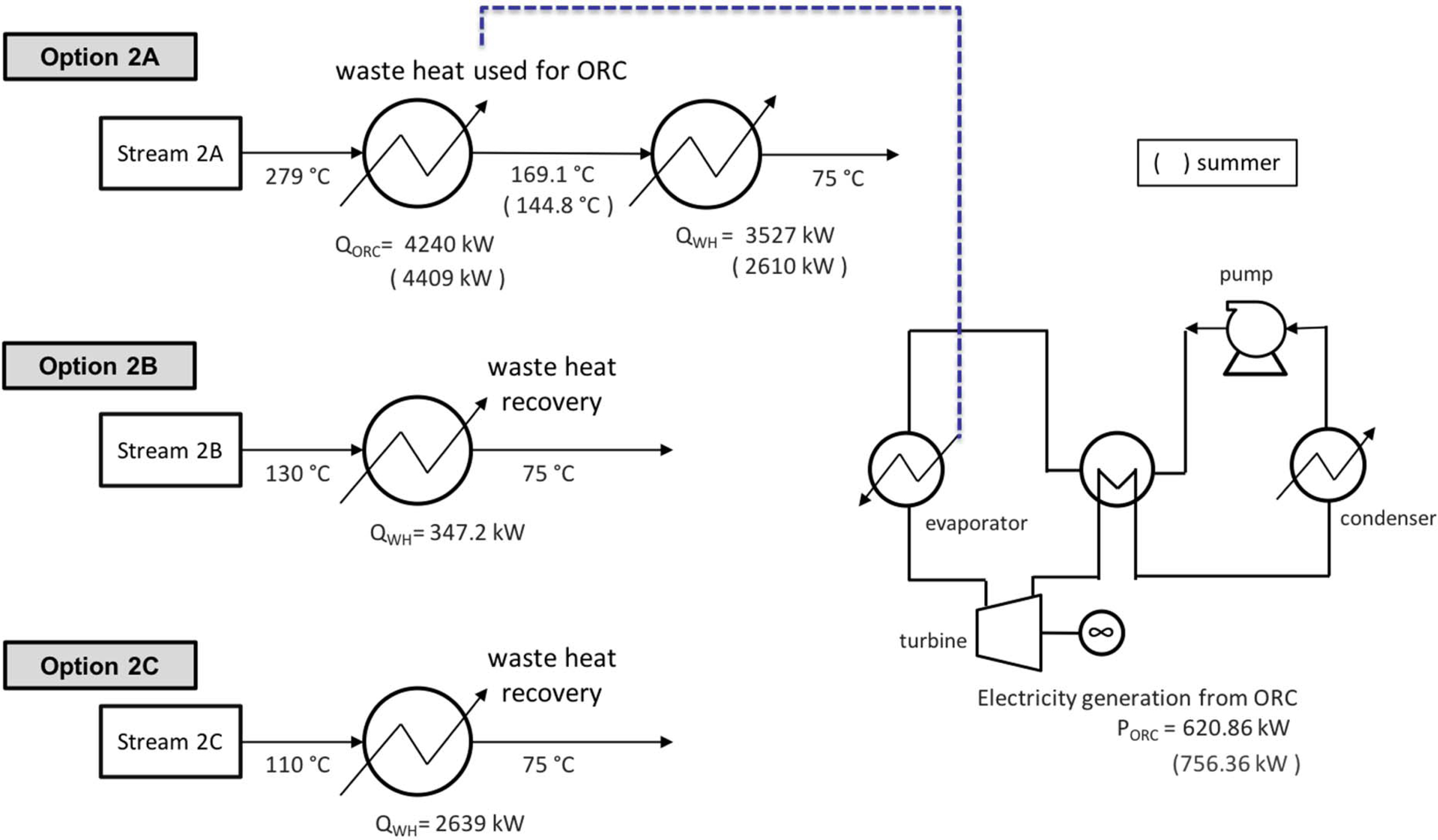 For Streams 2B and 2C, the application of ORC is not feasible, due to relatively low temperature for the evaporator of the ORC, and there is only waste heat recovery which is used for heating water as a heating source to the building. Waste heat available from Stream 2C is enough to provide heat necessary for the building, while the waste heat recovery of Stream 2B is not.