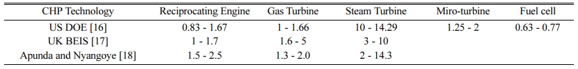 Operating characteristics of CHP systems are strongly dependent on technology-specific mechanisms to produce heat and power. Such difference results in different ranges for heat-to-power ratios (RH-P), as illustrated in Table 1. The CHP systems based on a reciprocating engine is better suited to the case of high RH-P. When further heat supply is desired, CHP systems based on a gas turbine can be considered. For the excessive supply of heat required, CHP systems based on steam turbines are to be selected. The ranges illustrated in Table 1 clearly imply that it is necessary to consider the heat-to-power ratio for the sizing of CHP units and to accommodate its impact on the operation of CHP units.