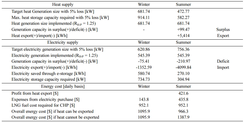 Considering the targeted capacity for the CHP unit, heat in summer is over generated, while the electricity is under generated, compared to the case without con- sidering RH-P. The amount of import or export of heat and electricity as well as overall energy cost are presented in detail in Table 2, which is reported in a daily basis for winter and summer, respectively. As, for summer, surplus heat may not be exported due to seasonal characteristics, energy cost is calculated depending on the possibility of heat export. However, no restriction on power export or import is assumed.