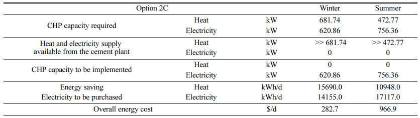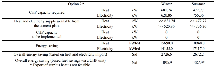 Tables 3, 4 and 5 shows the details of economic analysis for Options 2A, 2B and 2C, respectively. Option 2A can be seen as the most promising option, as the heat and electricity to be used for the building are covered from the industrial waste heat. Option 2B is the worst scenario due to the limitation in heat recovery without any potential for power recovery. It should be noted that economic analysis is only made for evaluation of energy cost, without considering capital investment required. If capital investment for the introduction of the ORC system or the facilitation of over-the-pence integration were considerably large, the economic benefit of energy recovery from the cement plant may not be seen as promising.