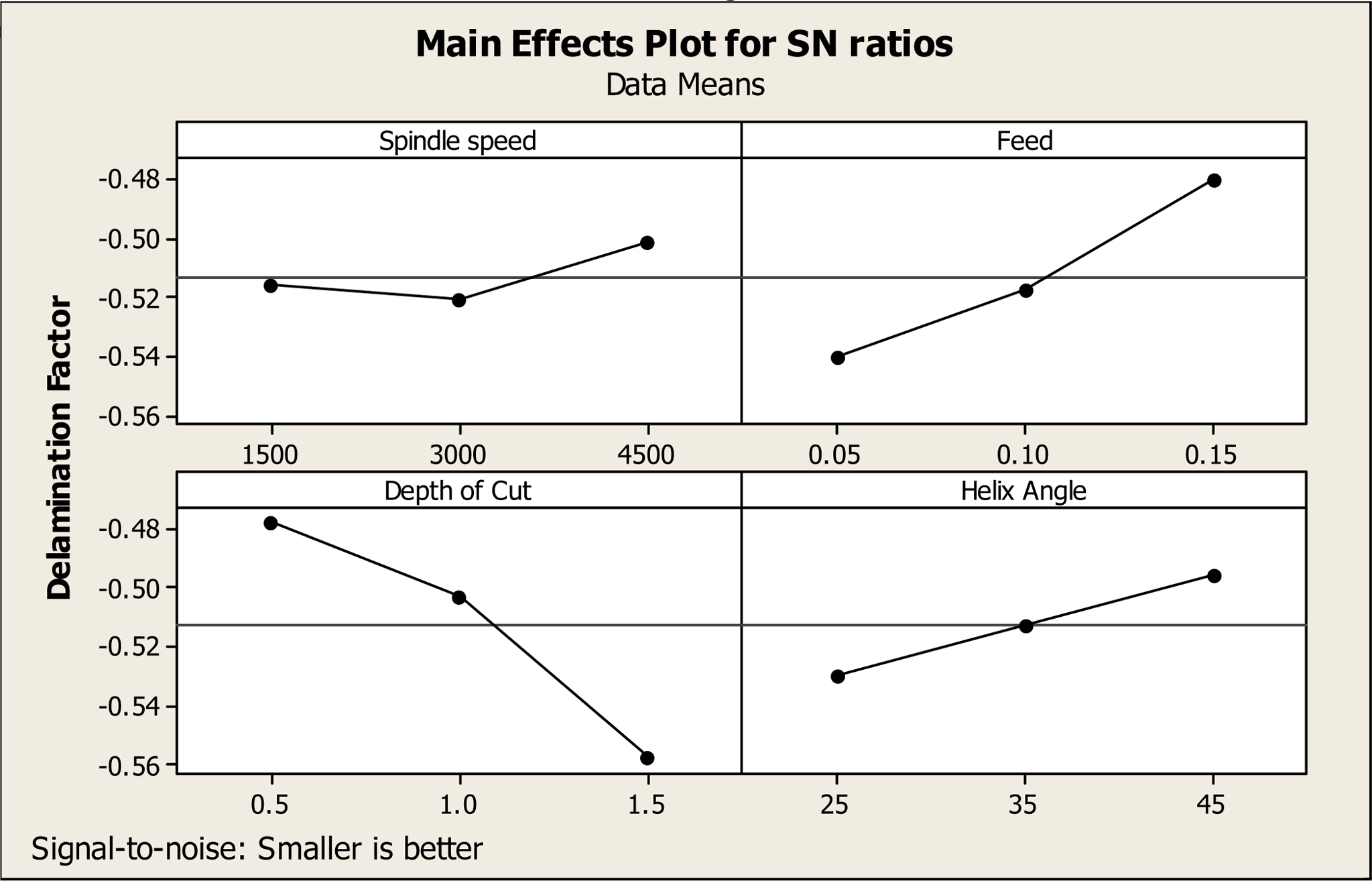 Fig. 1 Main effects plots for SN ratio for Delamination factor. |