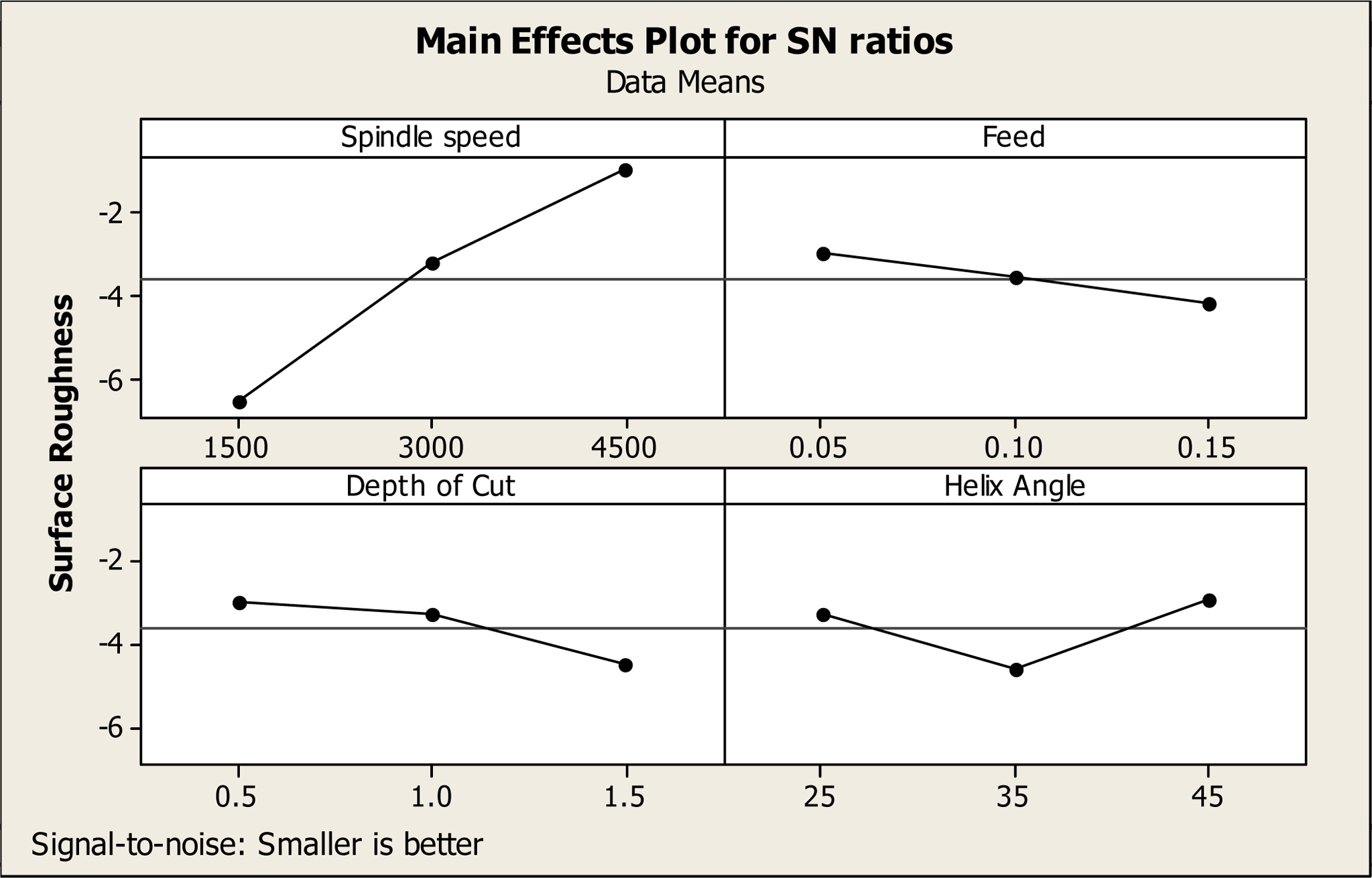 Fig. 2 Main effects plots for SN ratio for Surface Roughness. |