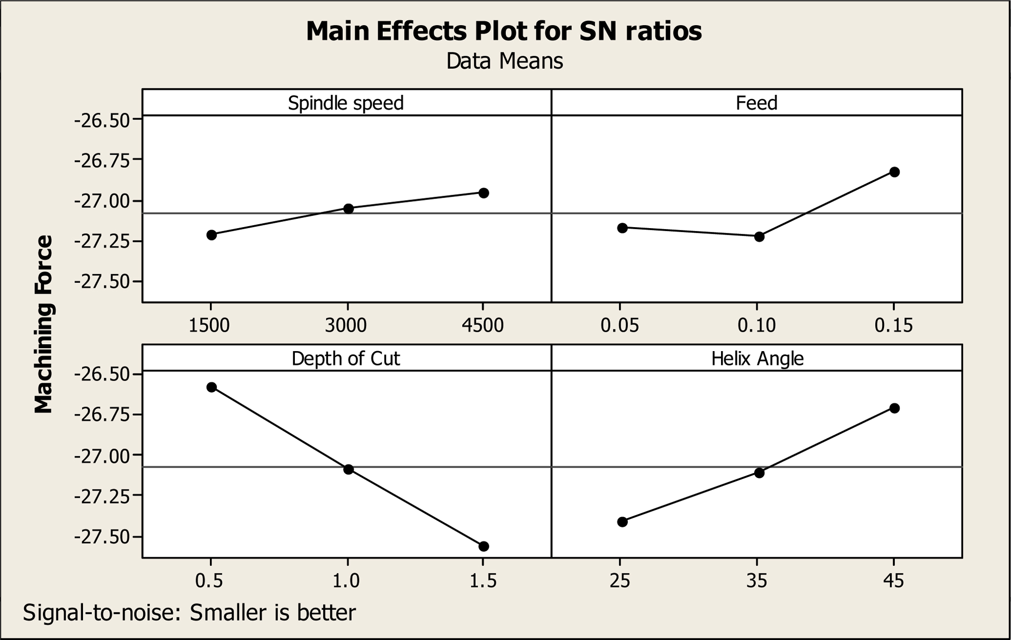Fig. 3 Main effects plots for SN ratio for Machining force. |