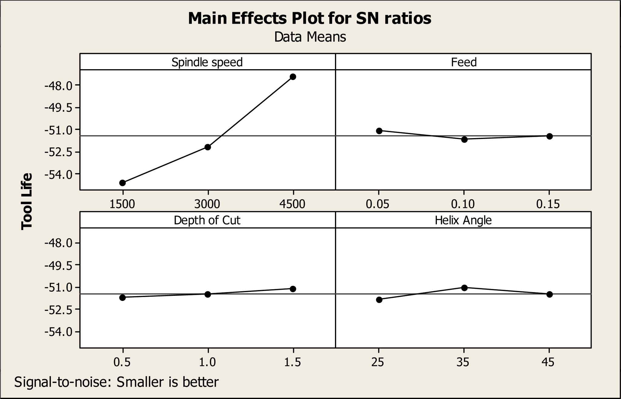 Fig. 4 Main effects plot for SN ratio for Tool Life. |