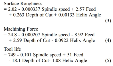 The relationship of the responses with the machining parameters were developed here by regression analysis. The regression equation for Delamination Factor, Surface Roughness, Machining Force and Tool Life were determined and given beow;