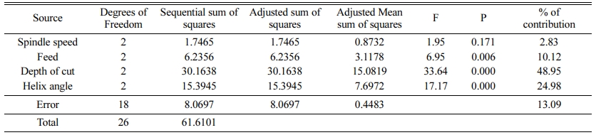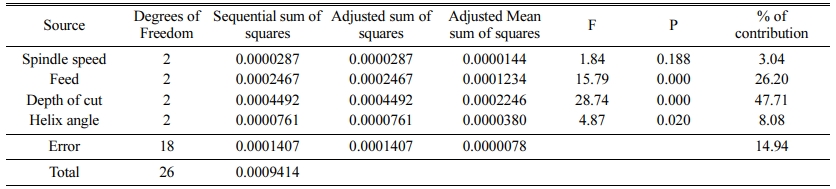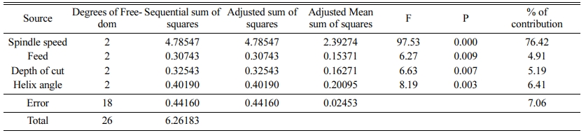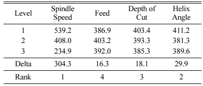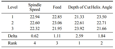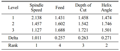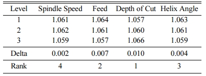 The Surface roughness model obtained by non-linear regression analysis is shown in Equation (3). The R-square value was estimated as 92.95%, which states the adequacy of the model and it is desirable for the prediction of the surface roughness of the composite materials. Table 4 shows the Analysis of Variance (ANOVA) for surface roughness during machining of the composite material using an end mill cutter in a CNC milling machine. It is observed that the percentage of contribution of spindle speed was 76.42%. However, the percentage of contribution of feed, depth of cut and helix angle were 4.91%, 5.19% and 6.41% respectively and they are very closer to each other. Taguchi analysis of the surface roughness was carried out and the response table for means for surface roughness is given in Table 5. It is observed that the spindle speed is the most dominant factor followed by helix angle, depth of cut and feed. The main effects plot for signal to noise ratio for the surface roughness is shown in Fig. 2, which describes the effect of surface roughness with respect to the cutting process parameter, viz., spindle speed, feed, depth of cut and helix angle. It is observed that as the spindle speed increases the surface roughness also increases gradually. Also it is seen that as the depth of cut increases, the surface roughness decreases to a certain extent. The increase in spindle speed will result in decrease in surface roughness and with increase in helix angle, the surface roughness increases to a certain extent.
