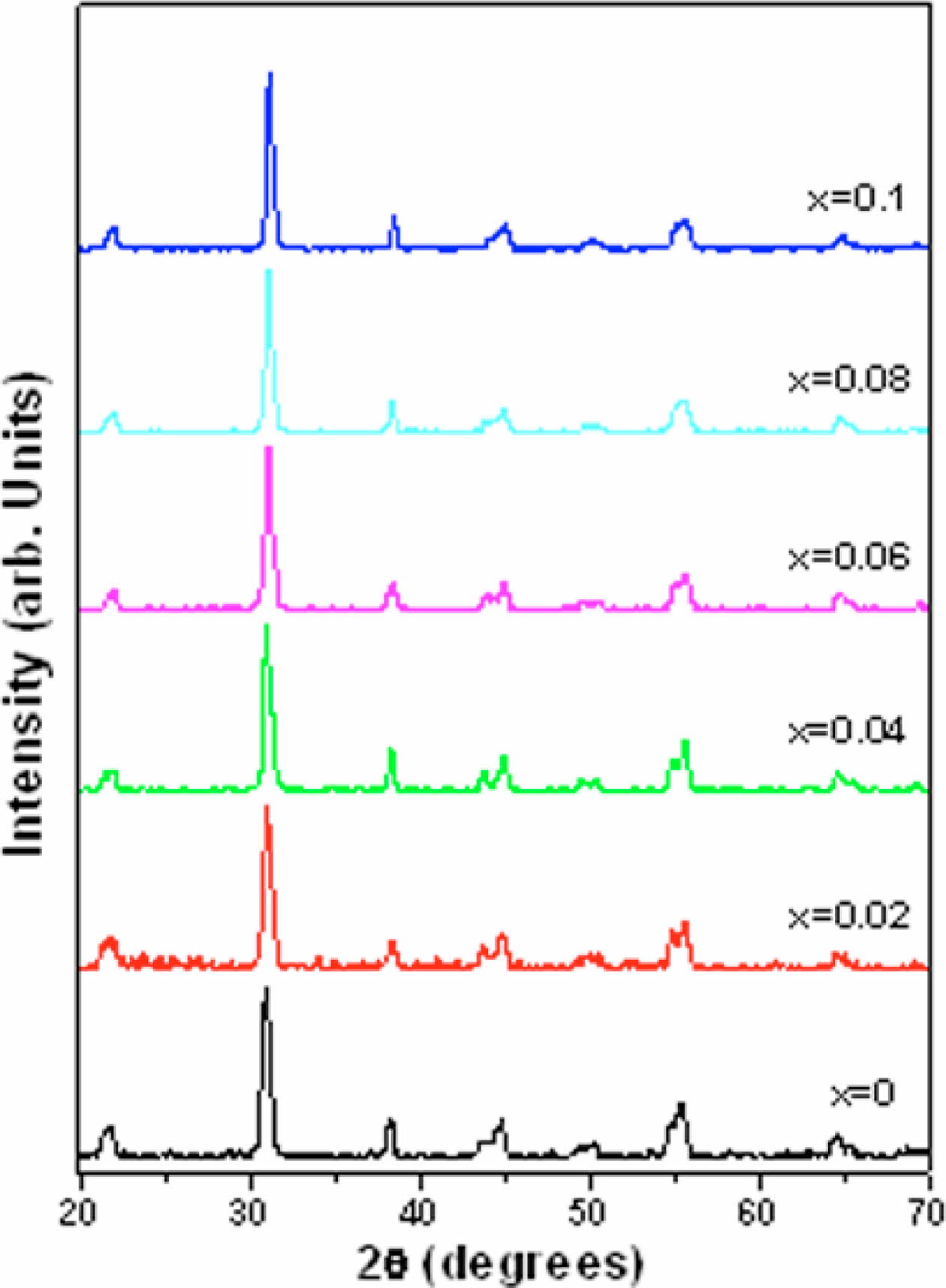Density of the samples has been measured using Archemedes principle at room temperature taking water as the medium. Density values of all the samples are found to be more than 95% of the reported density (~7.95 g/cm3) of pure PZT [16]. X-ray powder diffrac- tometer (Philips, PW 1830 generator) with CuKα radia- tion (λ = 1.5405 Å) in the range of Bragg angles 2θ (20⁰ ≤ 2θ ≤ 70⁰) was used to carry out phase formation in calcined powders.