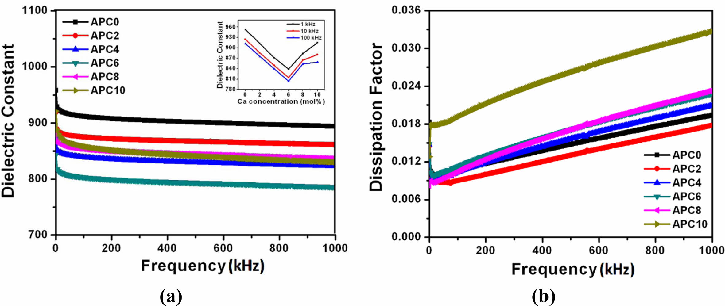 Fig. 3 (a) Frequency dependence of ε' at room temperature for the ceramics of APC Series (Inset Fig. 3(a): Variation of ε′ with calcium concentration at various frequencies) (b) Frequency dependence of tan at room temperature for the samples of APC Series. |