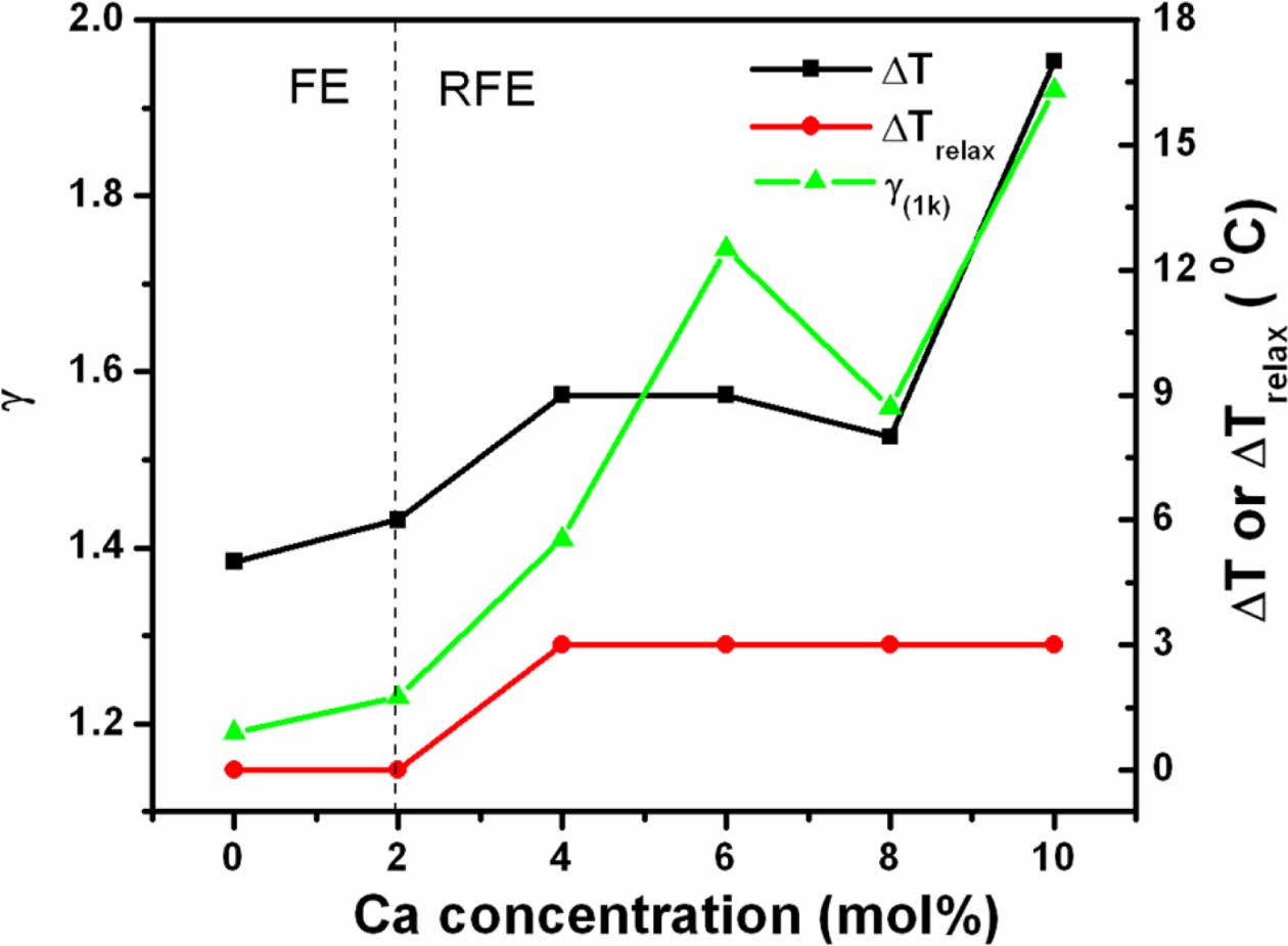 where ε 'max and T0.9ε' (max) are the maximum ε ' and temperature corresponding to90% of ε 'max for T > Tmax, respectively. Using equations (1-3), the variation of g, ∆T and ∆Trelax vs. calcium concentration has been plotted in Fig. 6.