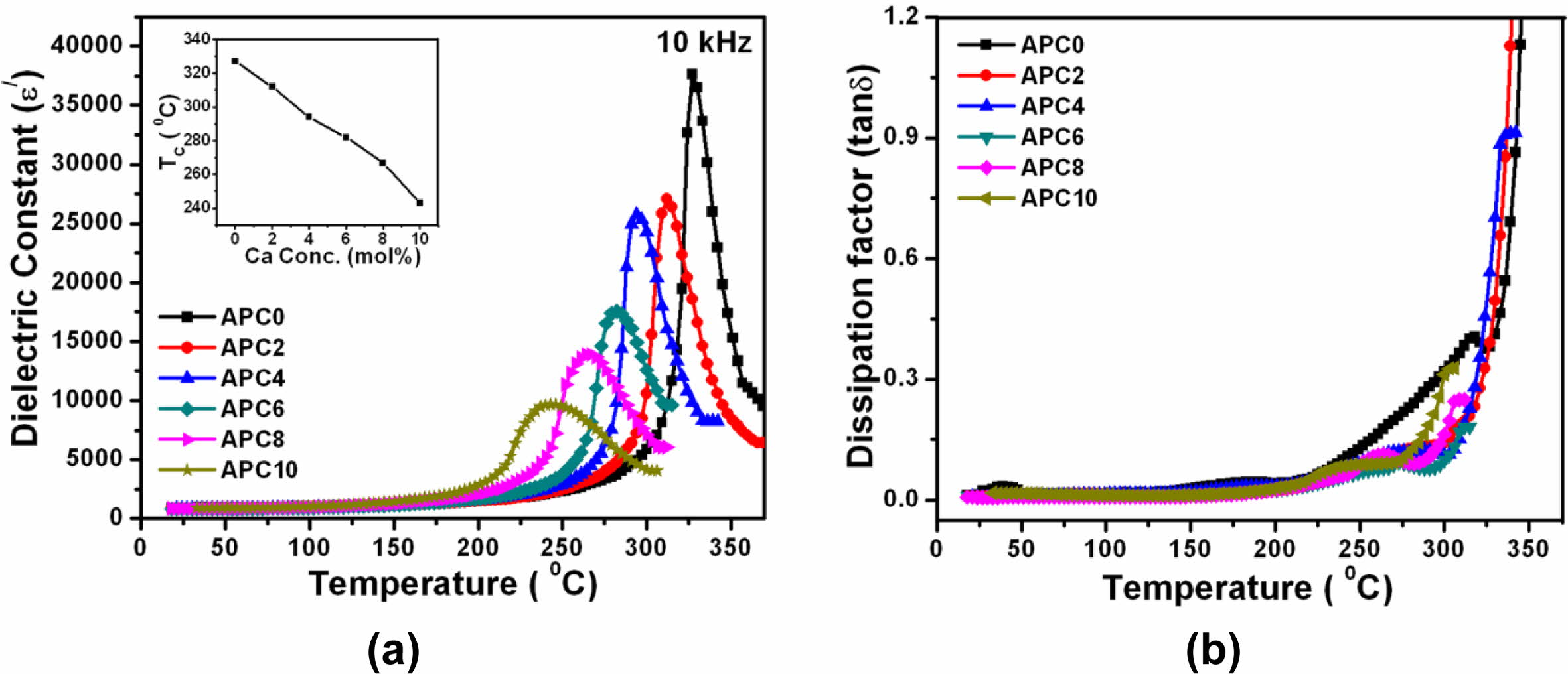 Fig. 7 (a) Temperature dependence of ε'for the samples of APC series at 10 kHz (Inset Fig. 7 (a): Variation of transition temperature with calcium concentration at 10 kHz) (b) Temperature dependence of tanδ for the samples of APC series at 10 kHz |