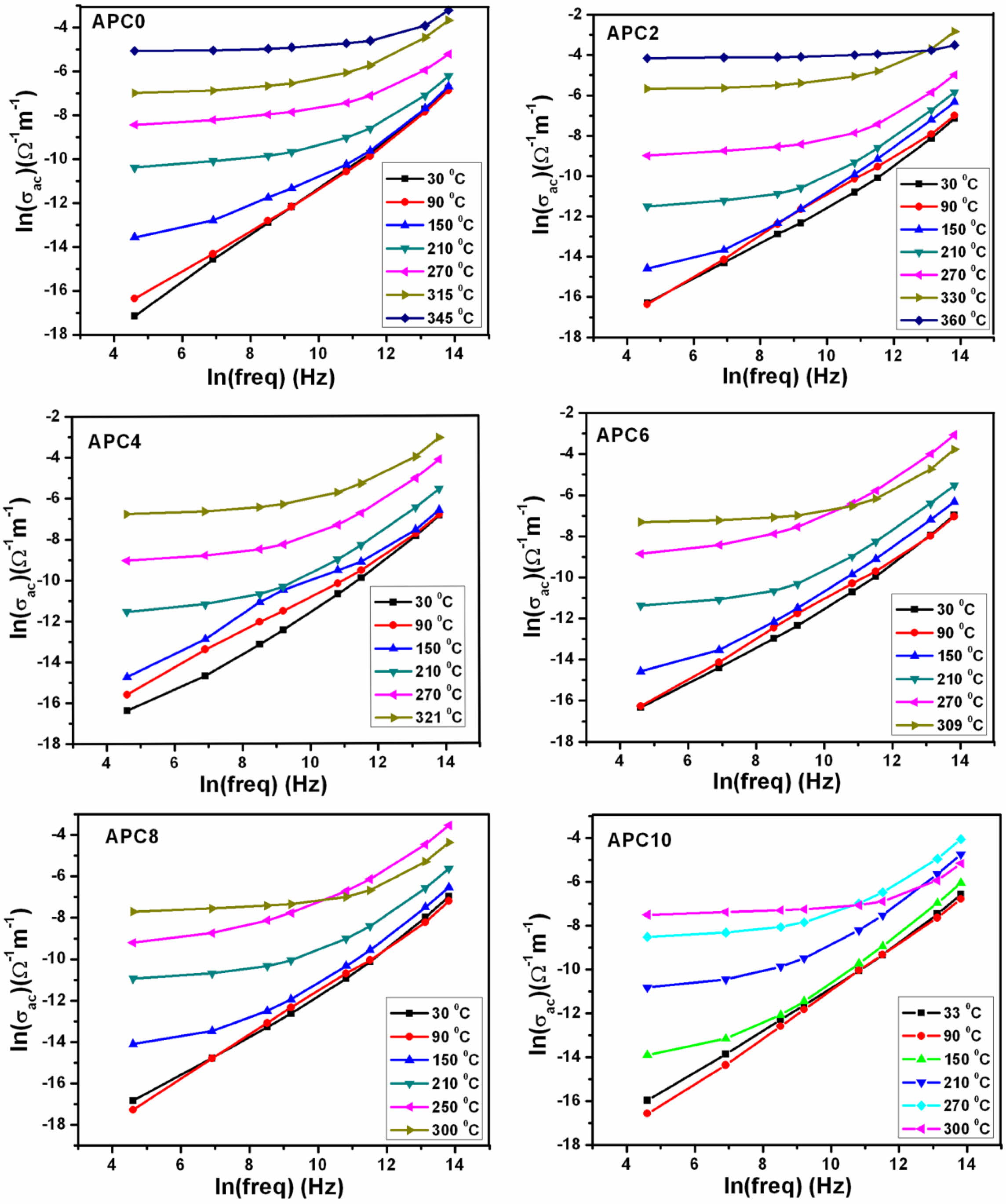 Fig. 8 Frequency dependence of ac conductivity at various temperatures for the samples of APC Series. |