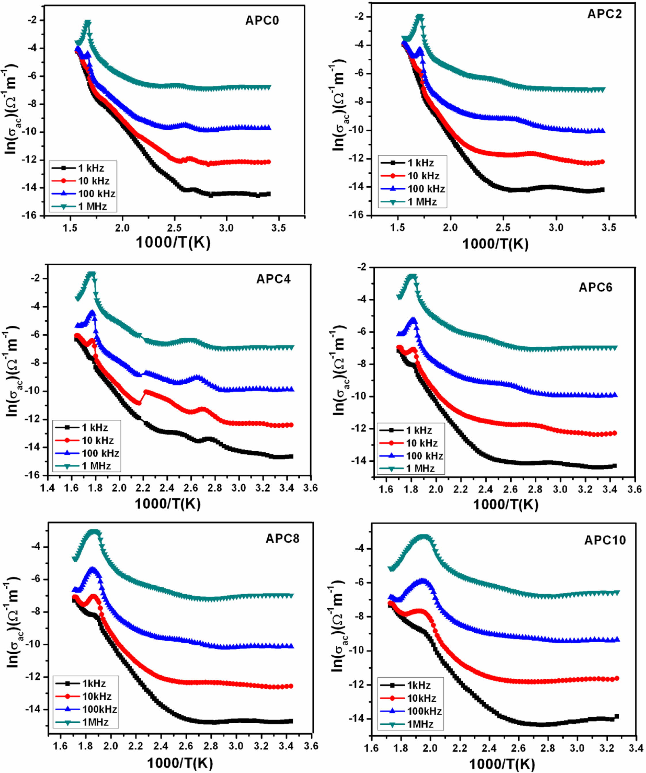 Fig. 9 Temperature dependence of ac conductivity for the samples of APC series at different frequencies. |
