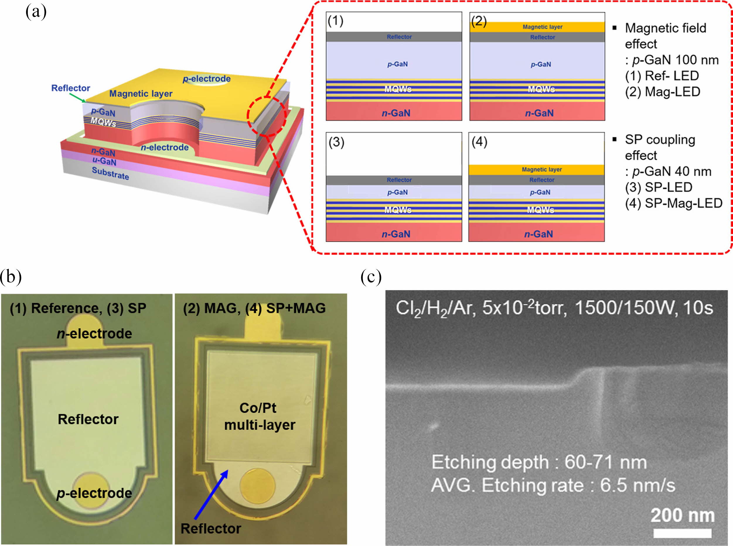 Fig. 1(a) shows a schematic illustration of NUV-LEDs with four different metal layer designs in the flip-chip LED structure. To test the magnetic field effect in NUV-LEDs with the p-GaN layer (100 nm), we fabricated devices with a ferromagnetic Co/Pt multi-layer on a Ag/Ni layer (Device #2 in Fig. 1(a)) and compared it to the device without the ferromagnetic layer (Device #1 in Fig. 1(a)). The ten period Co/Pt (1/1.5 nm) multi-layer was deposited onto the Ag/Ni reflector layer shown in the optical microscopy (OM) image of Fig. 1(b), using direct current magnetron sputtering. To turn aside oxidation of the magnetic layer, a Ta layer (3 nm) was deposited on the Co/Pt multi-layer as a capping layer. In the Co/Pt multi-layer, out-of-plane magnetization was maintained due to strong perpendicular magnetic anisotropy (PMA) [26]. Thus, the Co/Pt multi-layer does not require an additional magnetization process, such as applying high temperatures and an external magnetic field. However, the p-GaN layer thickness is likely much thicker than the penetration depth of the SP field. The penetration depth (Z) of the SP field in the GaN layer can be calculated by the following equation (1):