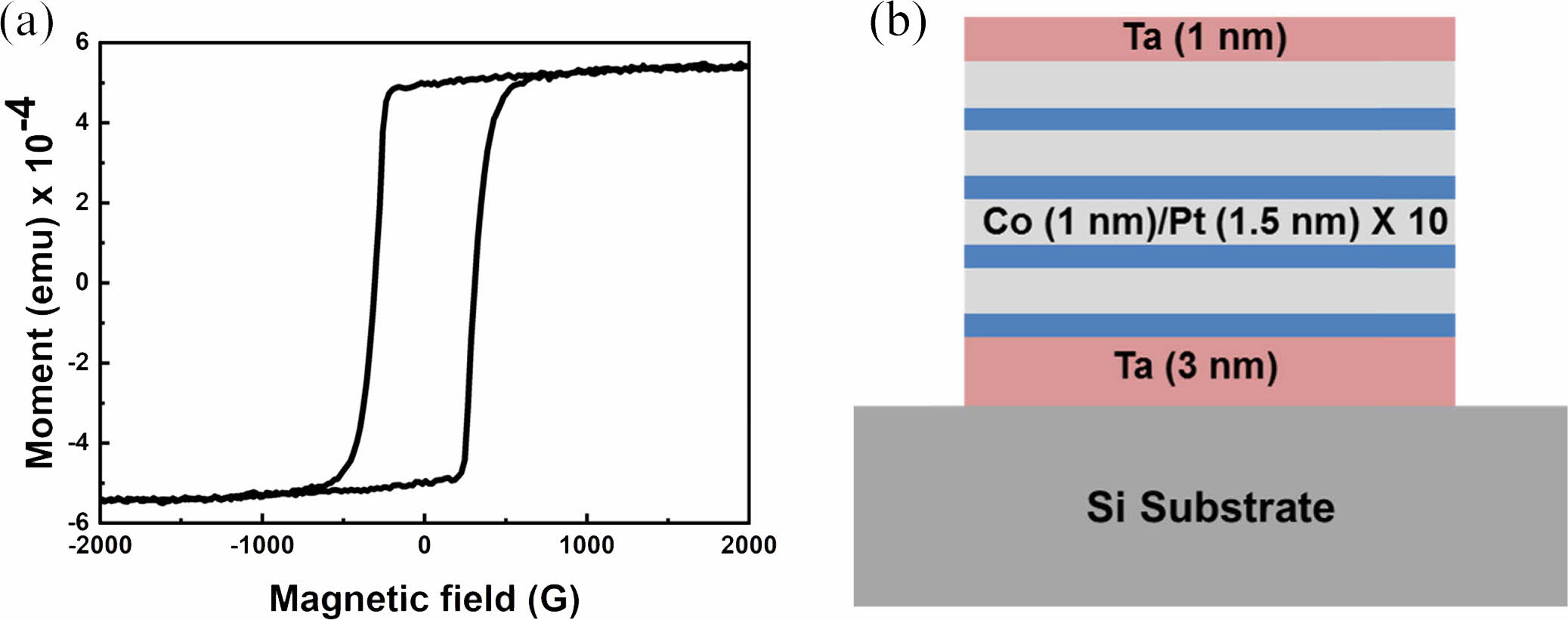 Fig. 2 (a) VSM characteristics of the Co/Pt multi-layer, showing a rectangular loop hysteresis with a saturation magnetization of 180 emu/ cm3 (@ 300 K). (b) Schematic diagram of Co/Pt multi-layer, which is composed of the top (1 nm) and bottom (3 nm) Ta capping layers and 10 pairs of Co (1 nm)/Pt (1.5 nm) layers. |