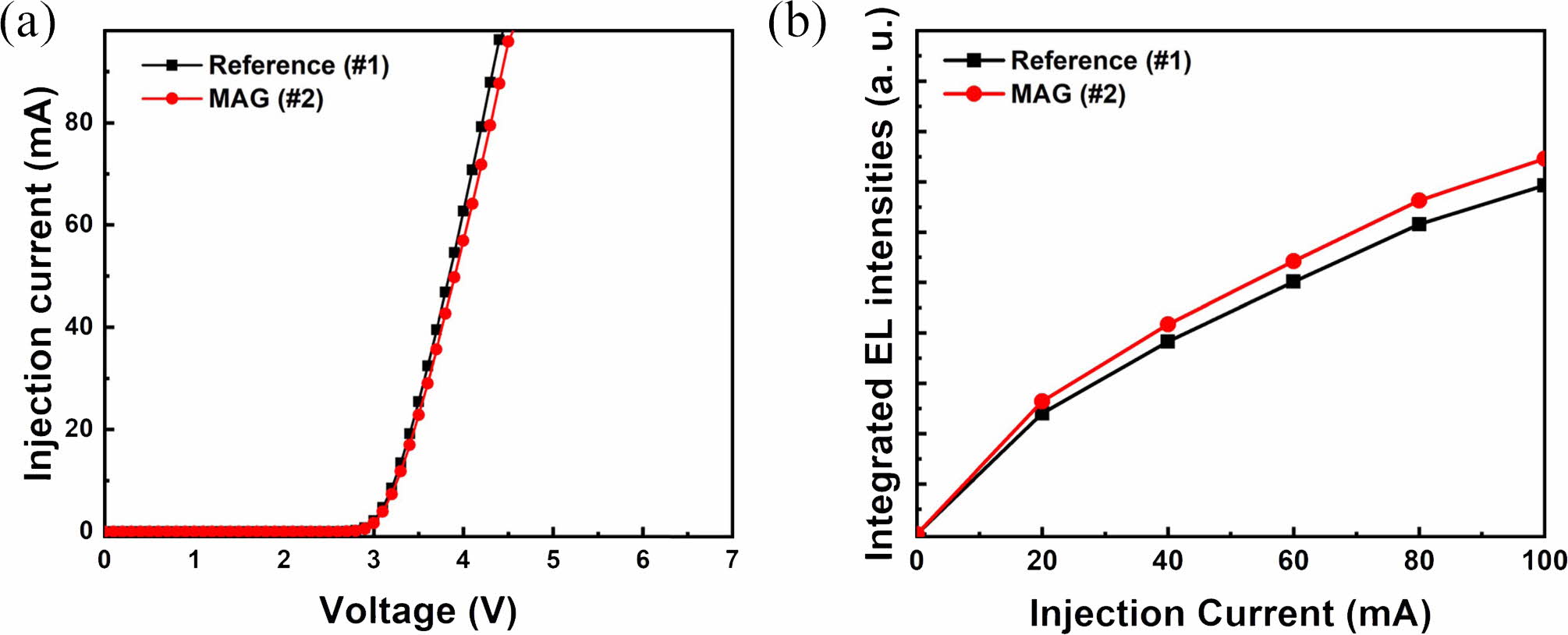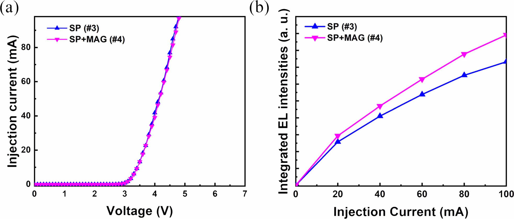 Fig. 3 (a) I-V characteristics of NUV-LEDs (p-GaN: 100 nm) with and without Co/Pt multi-layers (Device #1 and #2), showing a minor increase in series resistance due to the magnetic field effect on carrier transport. (b) Integrated EL intensity of NUV-LEDs (p-GaN: 100 nm) with and without Co/Pt multi-layers (Device #1 and #2), showing that the integrated EL intensities of NUV-LEDs with Co/Pt multi-layers are increased by 10.1% at a current injection of 20 mA. |