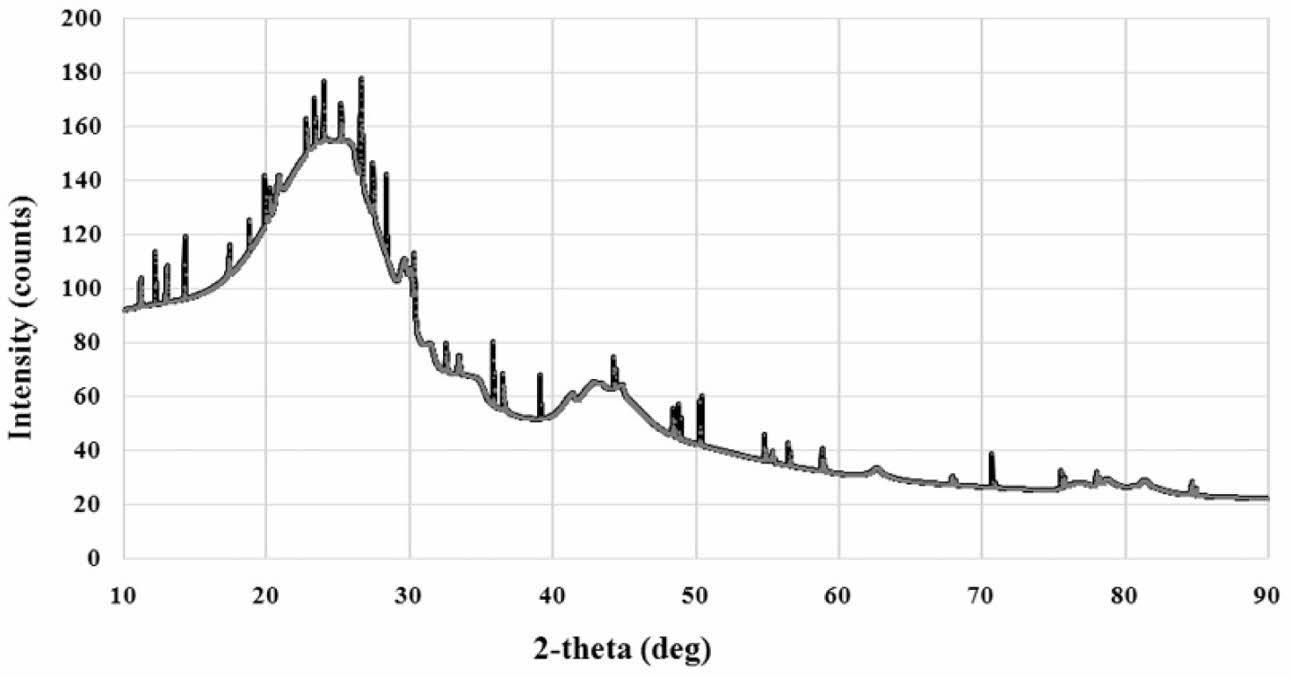 Carbon characteristic testing is done with XRD, with the profile shown in Fig. 1. The XRD test profile shows the structure of carbon materials with irregular atomic arrangements. The highest intensity is at an angle of 2θ = 24.25o. Other researchers also showed the carbon XRD test results that are close to the same, that the structure of the carbon material is amorphous. In this test two weak maxima diffractions showed negligible crystal phase content,especially at an angle of 2θ between 40-50o [15]. Organic waste carbon density tests showed 1.3794±0.12 [grams/cm3].