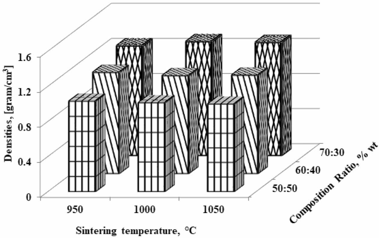 Fig. 2 Densities vs sintering temperature vs composition ratio |