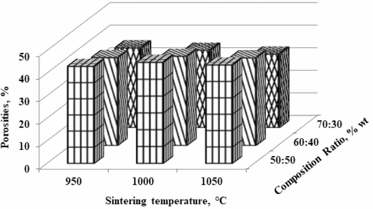 Fig. 3 Porosities vs sintering temperature vs composition ratio. |