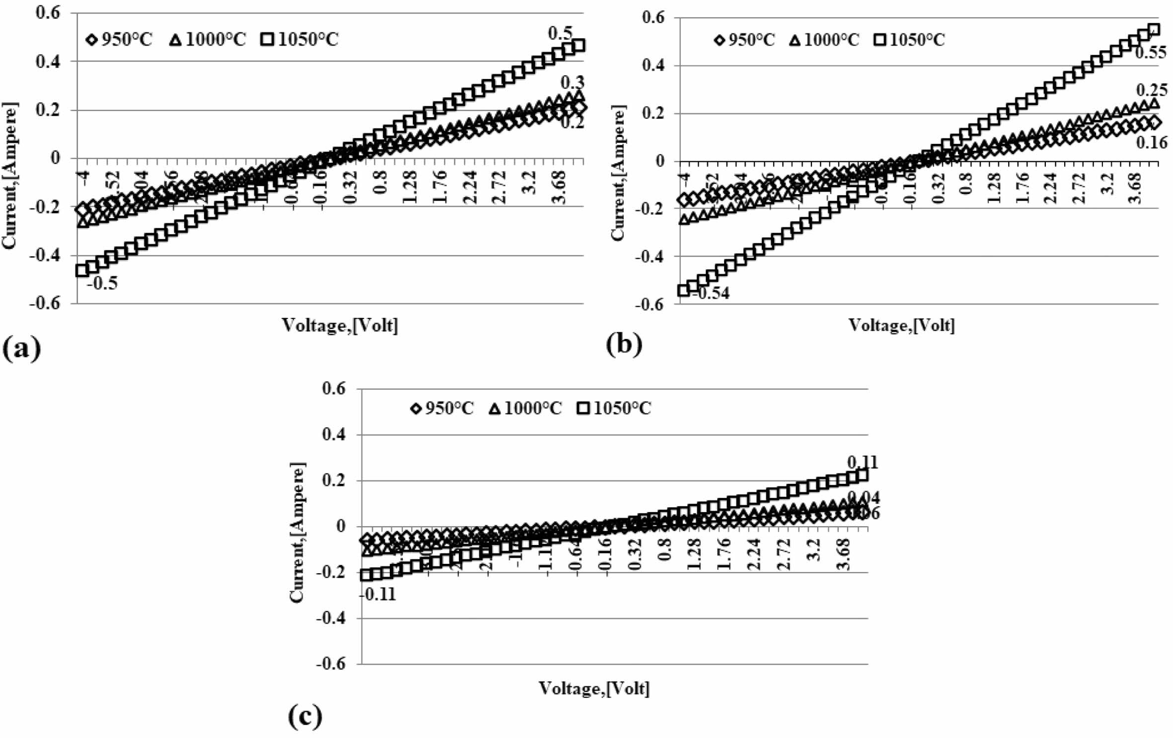 Meanwhile, at pyrolysis, sintering temperatures of 950 oC and 1000 oC produces an electric current flow of 0.2 and 0.3 [Ampere], relatively equal to composites with a composition ratio of 50:50% weight, this is shown in Fig. 4(b). The lowest electric current flow is shown in Fig. 4(c); this carbon-ceramic composite is formed with a composition ratio of 70% kaolin and 30% carbon weight, with a voltage flow of 4 [volts], in the sintering process 950 oC conducts an electric current of 0.05 [Ampere], the sintering process is 1000 oC capable of flowing a 0.06 [Ampere] sintering process, and 0.1 [Ampere] for sintering 1050 oC. The trend line indicated by all charts indicates that the greater the voltage channelled on the ceramic composite, the more significant the current flow. Likewise, the higher the temperature of the sintering process, the higher the electric current that can flow through the carbon-ceramic composites of the study.