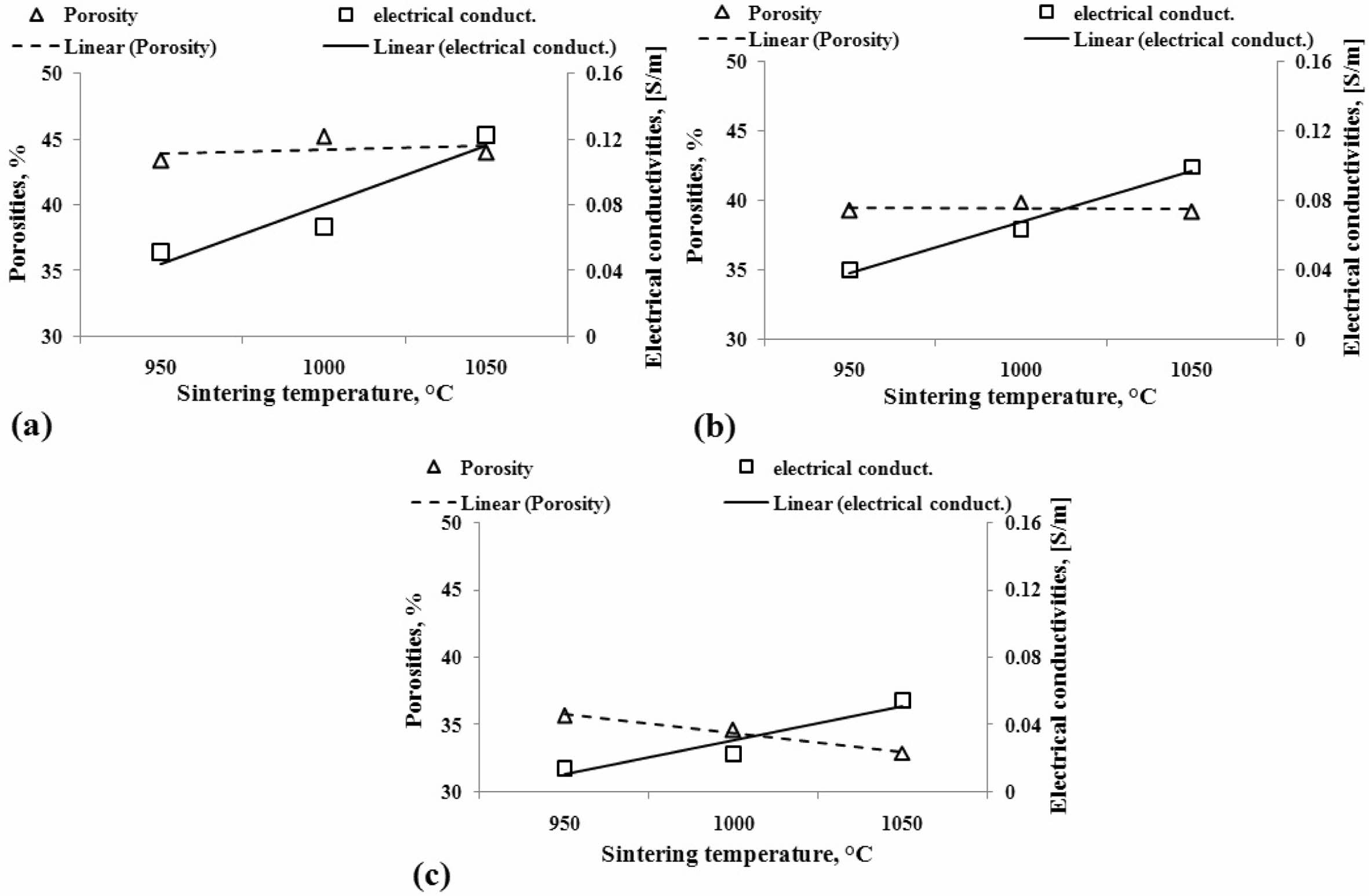 Discussion of the relationship between electrical conductivity and composite porosity in this study will only explain the phenomena and tendencies in both variables. Porosity is the form of cavities or spaces that separate the relationships between particles or elements from carbon-ceramic composites, and thus this condition will affect the delivery power of electric current or electrical conductivity. The discussion is shown in Fig. 6. In general, the increase in temperature in the sintering process influences the increase in the electrical con- ductivity of composites. However, when associated with the percentage of composite porosity, the results of this study can be said that porosity does not affect electrical conductivity significantly. Because, although porosity at values tends to be stable at relatively equal per- centages, electrical conductivity nevertheless increases with increased sintering temperature, mainly shown in Figs. 6(a) and (b), with carbon weight volume content of 50% and 40% wt. Meanwhile, the effect of tempera- ture sintering on porosity and electrical conductivity shows opposite tendencies in Fig. 6(c). In the image, when porosity decreases, electrical conductivity increases with increased sintering temperature.