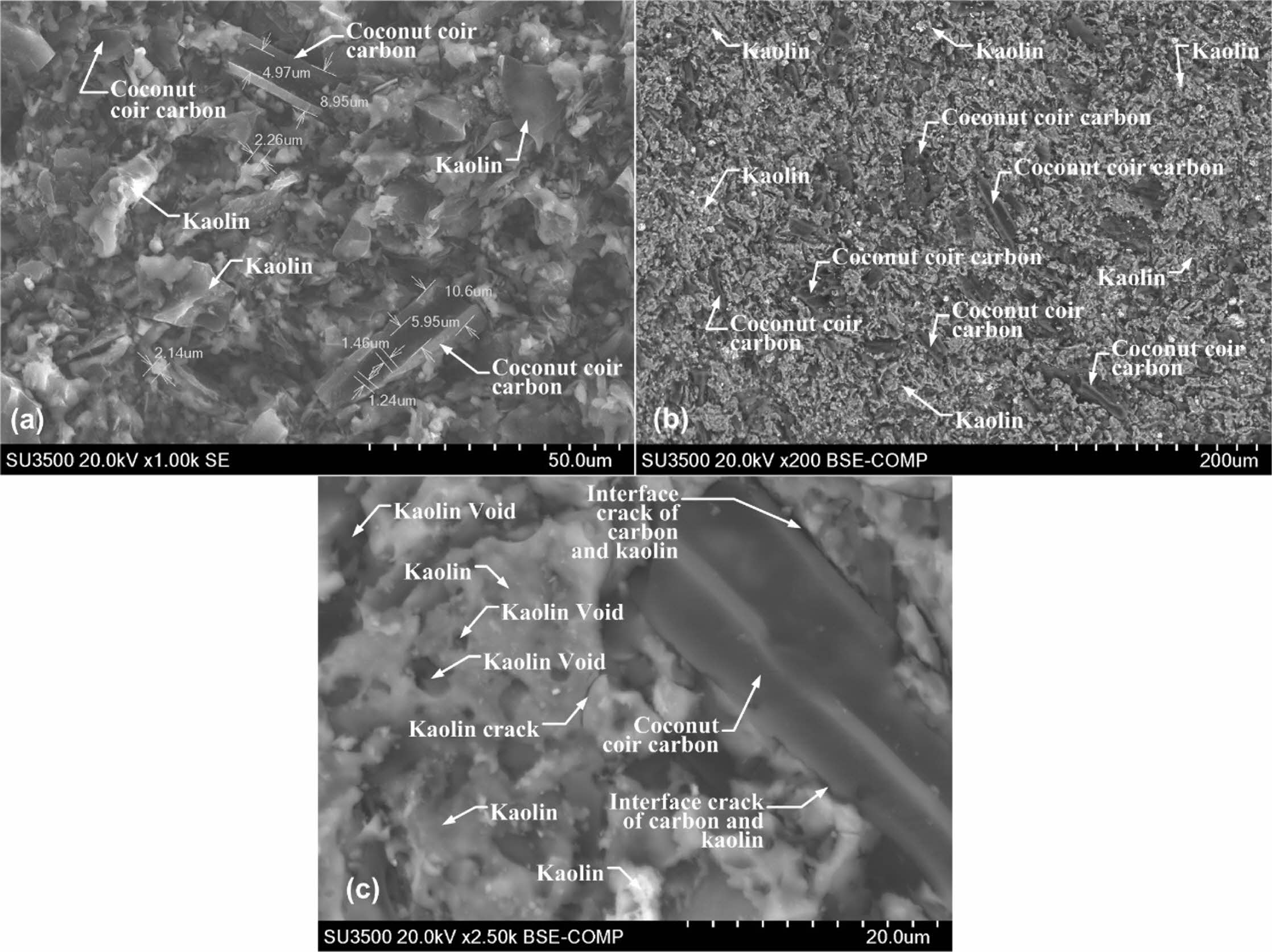 The distribution does not appear evenly, and this happens because the geometric shape of coconut coir carbon fibre is relatively irregular, both in shape and size, as shown in Fig. 7(b). Dark grey colour with an elongated groove shape that appears parallel indicates coconut coir carbon. Lighter grey and irregularly shaped colours such as curly hair indicate kaolin matrix, small dark black features indicating porous contained in the composite bulk. Features of interface cracks, matrix cracks and carbon filler cracks are shown in Fig. 7(c). The shape of the coconut coir carbon is very clearly indicated by an elongated rough shape and grooves that appear parallel, with a dark grey colour. Features with a surface that appears flat and smooth indicate a kaolin matrix with dark black porous holes. The long black line between kaolin features and carbon powder shows a crack in the interface between the kaolin matrix and the carbon powder. The micro-features contained in the composite bulk show porosity and cracks, and discon- nection of connectivity between the filler carbon powder. Such conditions weakened the electrical current delivery power in the composite bulk in this study.