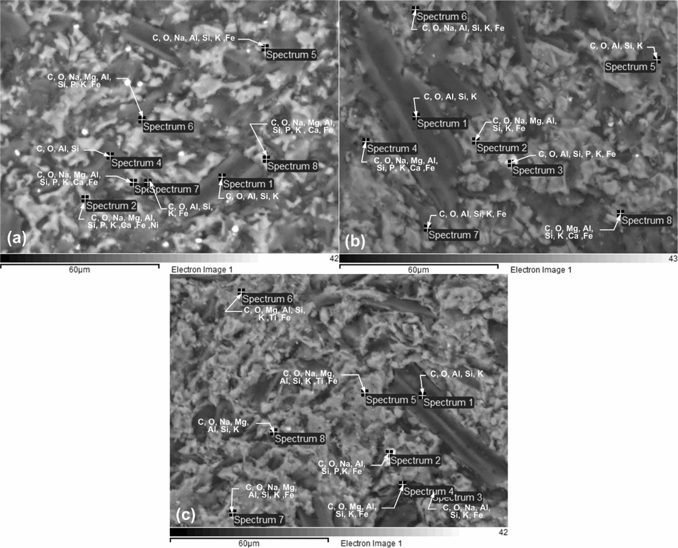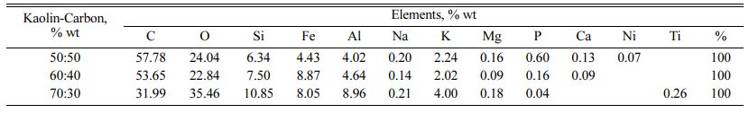 Fig. 8(a) shows the spectrum of observations on kaolin-carbon ceramics with a composition ratio of 50:50% wt. Each spectrum point shows the presence of the element carbon as the element with the highest percentage, followed by the oxygen element as the second largest element after carbon. The carbon element in this composition ratio is estimated at 57.78% wt, and the oxygen element is 24.04% wt. Other elements in kaolin-carbon ceramics include Si, Fe, Al, Na, K, Mg, P, Ca, and Ni. The percentage of the weight of the element is shown in Table 5.