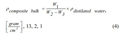 Note: rComposite = composite density [g/cm3]; rDistillation water= density of distillation water 0.992 [g/cm3]; W1 = dry composite bulk weight; W2 = composite weight saturated water in the air; W3 = composite weight saturated water in water.