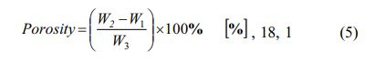 Sample mass in dry conditions (W1) weighed first. Next, the sample is soaked in a measuring glass con- taining distilled water until no air bubbles arise to ensure all pores are filled with water. Then the bulk composite saturated distillation water is weighed open (aired) (W2), the saturated composite of distillation water is weighed in distillation water (W3).