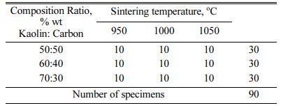 The shape and dimensions of the research sample have not yet followed the geometry of the components in question. The research was developed from local kaolin materials from Singkawang, West Kalimantan, Indonesia, and synthetic carbon from the organic waste of coconut coir.