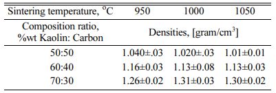 Density testing is done to determine the density of kaolin-carbon composites. The test was conducted experimentally using the Archimedes method based on the DIN-51097 standard. Carbon ceramic composite density calculated by equation (4),