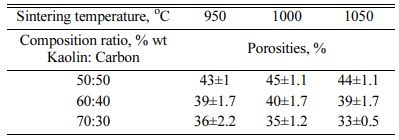 The highest porosity is indicated by a composition ratio of 50:50% weight; sintering temperature of 1050 oC, with a porosity of 44%. This value indicates that the composite contains a pore cavity amounting to 44% of the volume. The increase in sintering temperature did not significantly change the porosity of the composite. At the same time, the volume of kaolin weight affects the percentage of porosity. The higher the volume of kaolin weight, the lower the composite porosity value. This fact is normal because theoretically, the tendency of porosity values is opposite to the density value. The lowest value of 33% is indicated by a composition ratio of 70:30% weight at 1050 oC. This fact also raises the suspicion that carbon contains a lot of porous. The increase in pyrolysis sintering temperature does not change porosity significantly; porosity that occurs in carbon-ceramic composites at each composition ratio tends to be stable at adjacent values, as shown in Table 4. In comparison, some studies show the following.