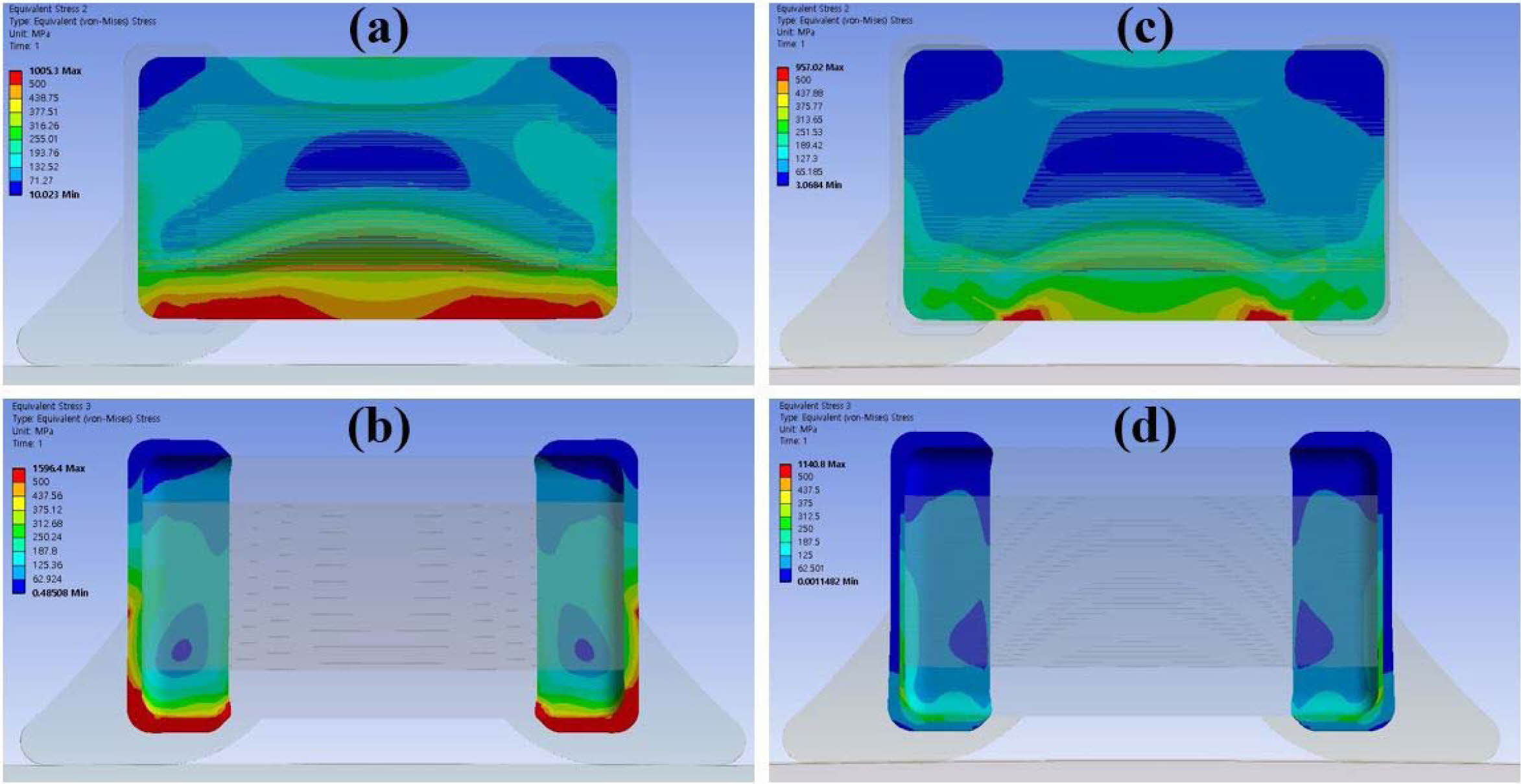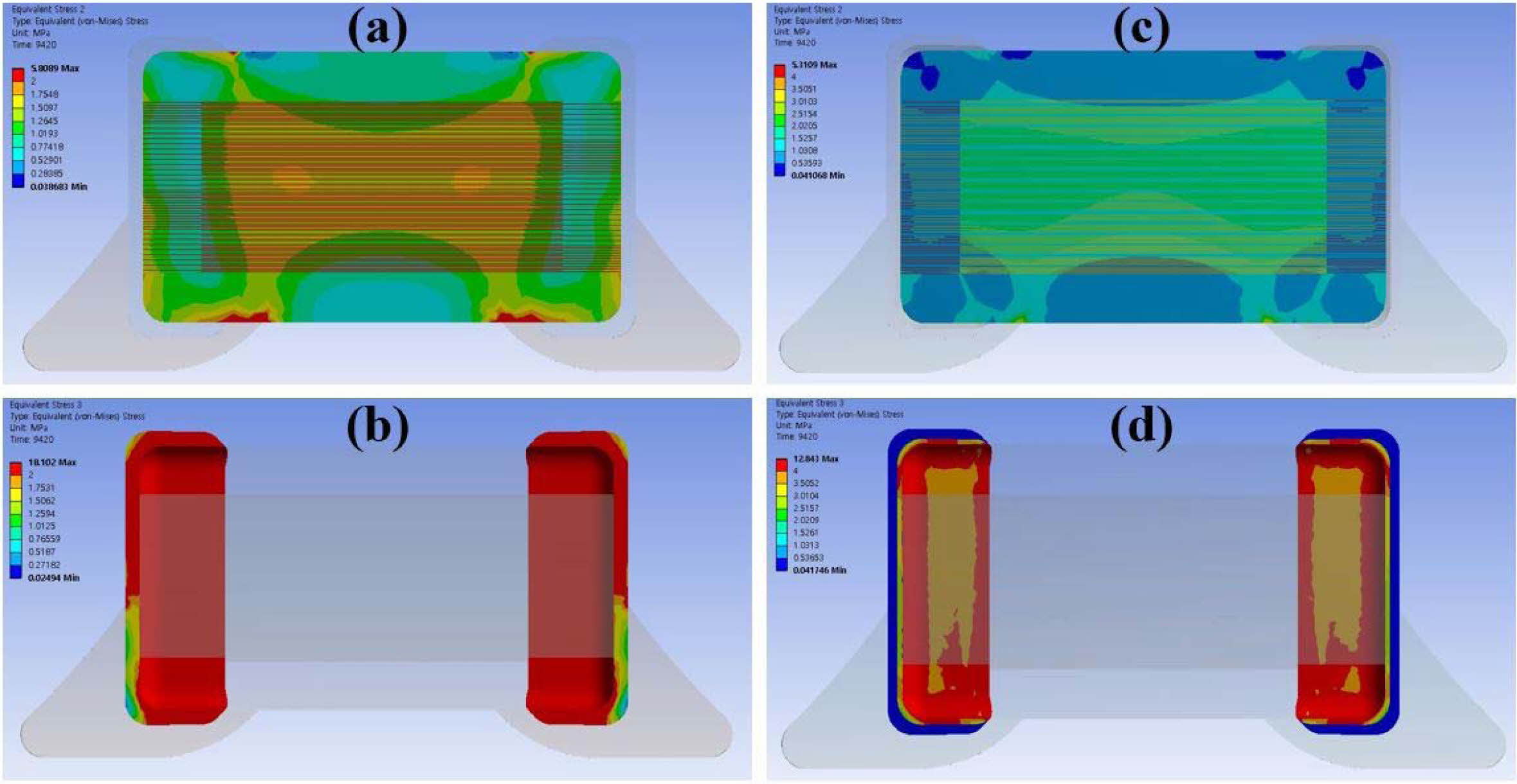 Fig. 1 The result of FEM analysis as a function of under 5 mm bending displacement conditions (a) MLCC body area of standard type (b) External electrode area of standard type (c) MLCC body area of soft-termination type (d) External electrode area of soft-termination type. |