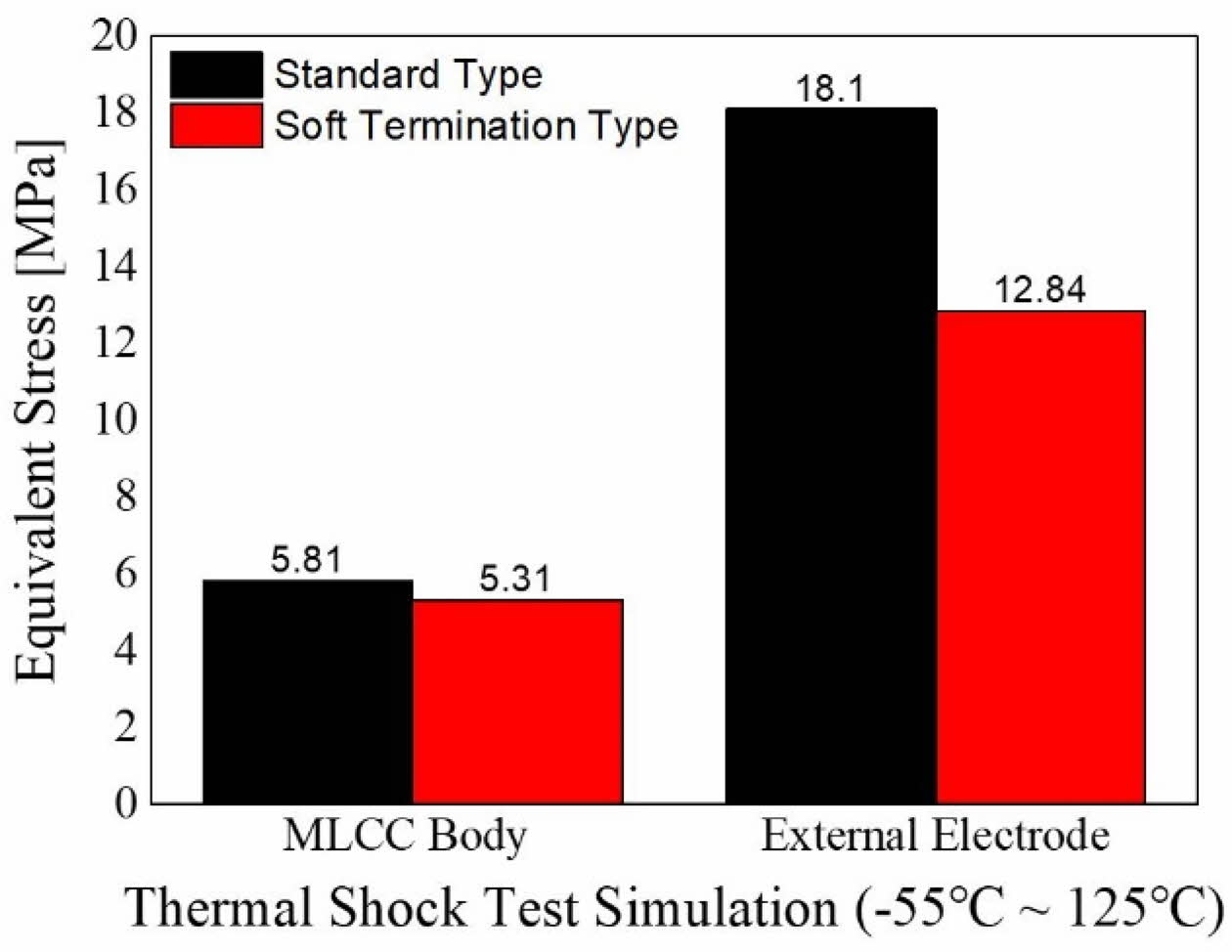 The stress generated in the thermal shock simulation can be observed in Fig. 4, and the result is similar to that of the board flex simulation in Fig. 2. Although the stress reduction in MLCC body due to the utilization of the Ag-epoxy electrode was insignificant (5.81 MPa to 5.31 MPa), the stress in the external electrode region was reduced by 29% (18.1 MPa to 12.84 MPa). Therefore, mechanical and thermal simulation demonstrated that Ag-epoxy electrode prevents the deformation due to mismatch of different properties of the materials.