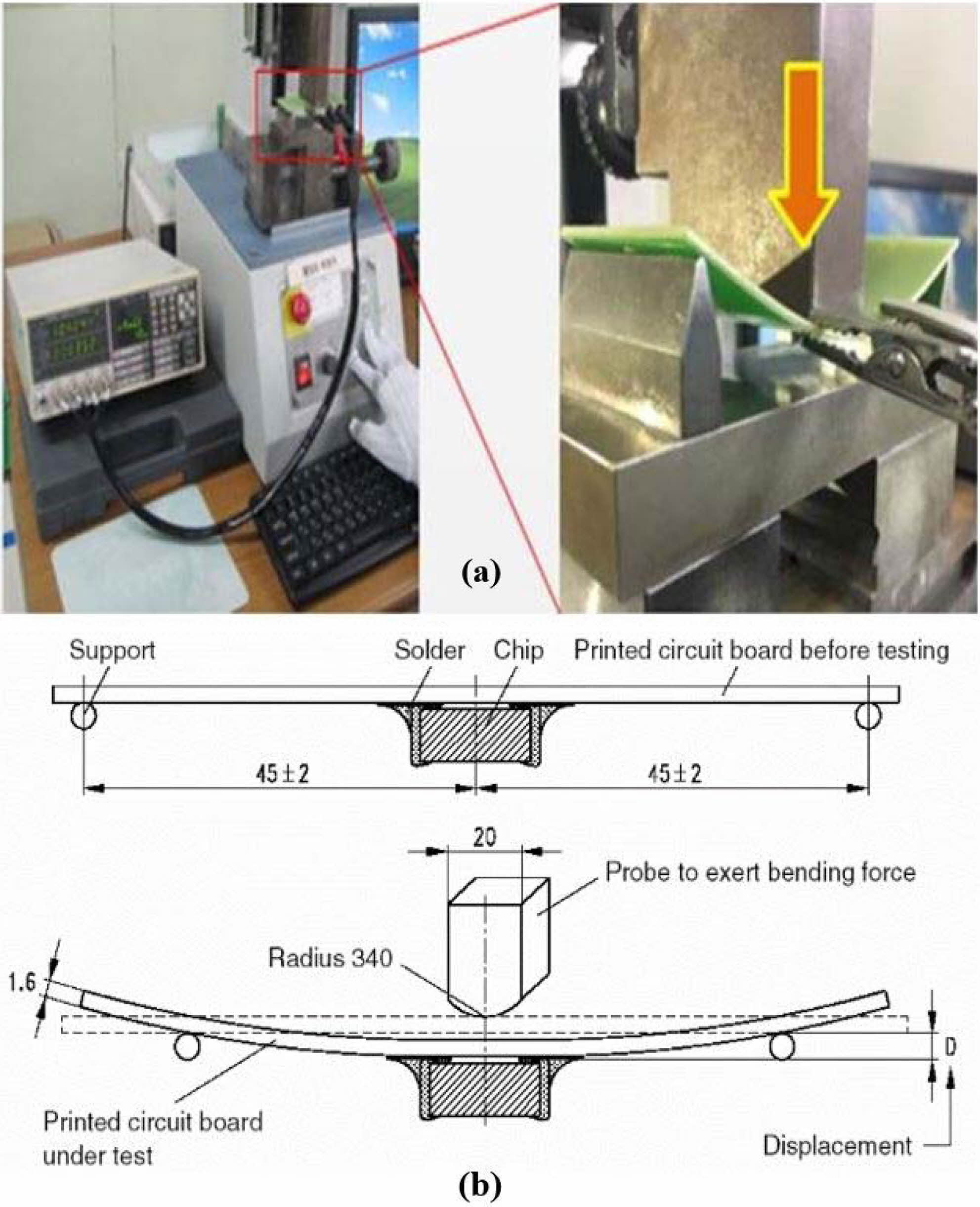 Fig. 5 The measuring equipment and industry standard (IEC-384-1) of the board flex test (a) Measuring equipment of the board flex test (b) Industry standard (IEC-384-1) of the board flex test. |