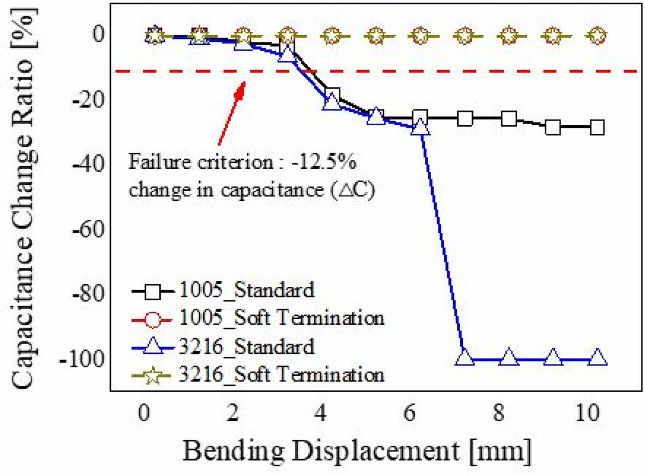Fig. 6 depicts the board flex test results according to the MLCC chip size and external electrode. It can be observed from the board flex test results of standard and soft-termination types in Fig. 6 that the capacitance change ratio of soft-termination MLCC with Ag-epoxy electrode was approximately 0% up to 10-mm bending displacement. Conversely, the capacitance of the standard-type MLCC (1005 size) decreased from 4-mm bending displacement to below the -12.5% limit, and recorded approximately -35% until a 10-mm bending displacement. The standard-type MLCC with a 3216 size was similar to that of 1005 size up to 6-mm bending displacement. However, it exhibited a capacitance reduction rate of approximately -100% from 7-mm bending displacement. As a result of the board flex test, when Ag-epoxy was used, it was possible to verify the characteristics of the substrate bending resistance, and it can be observed that the possibility of bending cracking occurred when the MLCC size was increased.