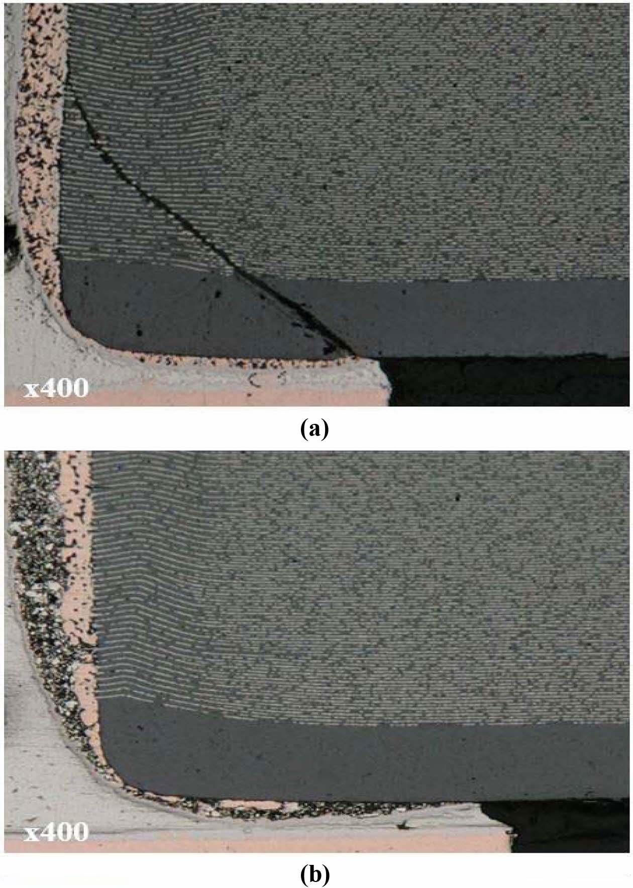 Fig. 7 Cross-sectional image after board flex test (a) Standard type MLCC of 1005 size (b) Soft-termination type MLCC of 1005 size. |