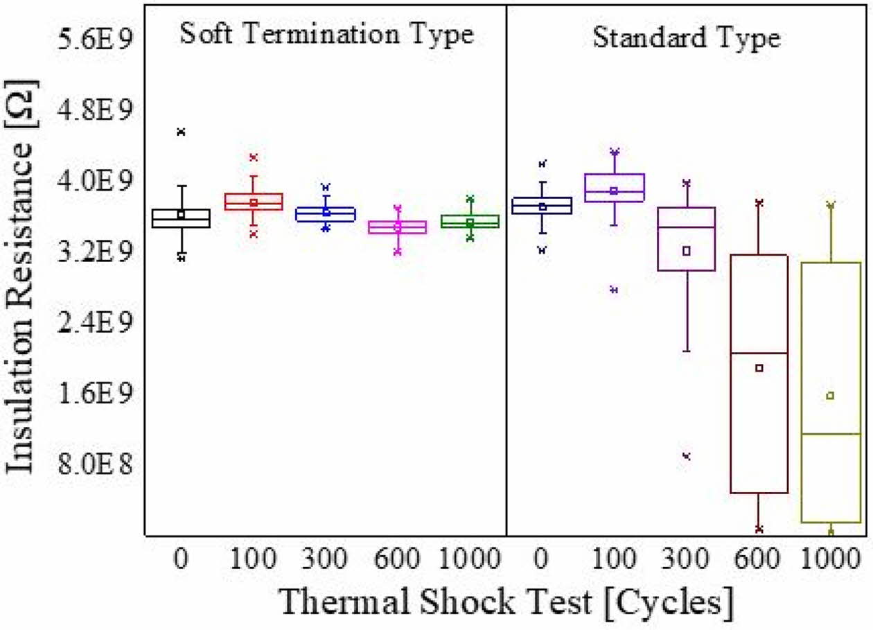 Fig. 8 The results of insulation resistance as a function of thermal shock test cycle. |