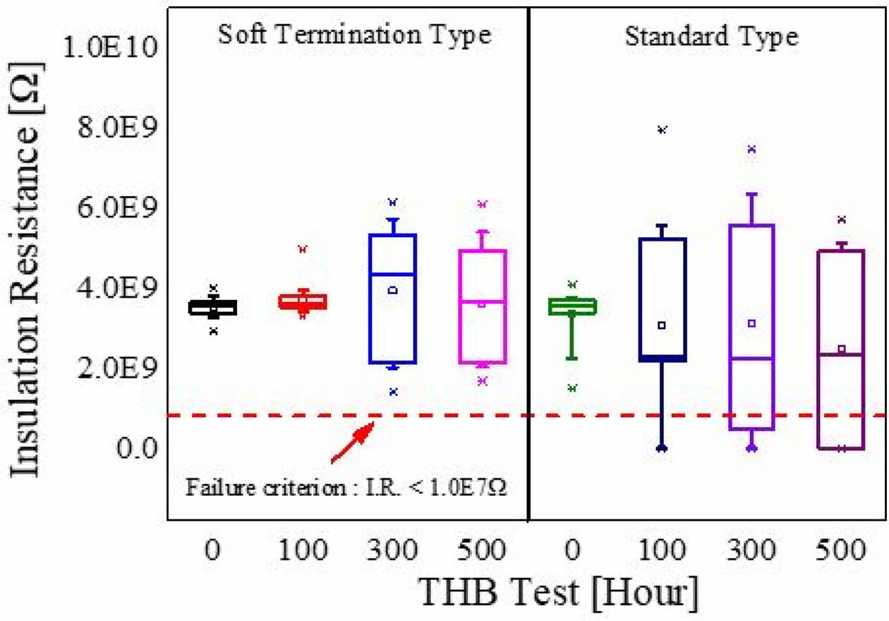 Fig. 9 depicts the results of insulation resistance according to the THB test. For the THB test, the standard-type and soft-termination-type MLCC samples were inserted into the THB test jig, and the rated voltage was applied at 85 oC/85% RH conditions for a duration of 500 h [22]. The two types of insulation resistance measured before the test were 3.5E9 Ω or greater. In the case of standard-type MLCC, the value of insulation resistance measured after 100 h exhibited a large standard deviation, and defective products falling below 1.0E7 Ω also occurred. In contrast to the standard-type MLCC, the insulation resistance of the soft-termination-type MLCC did not decrease to an insulation resistance of 1.0E7 Ω or lower even though the standard deviation of the insulation resistance measured after 300 h slightly increased.