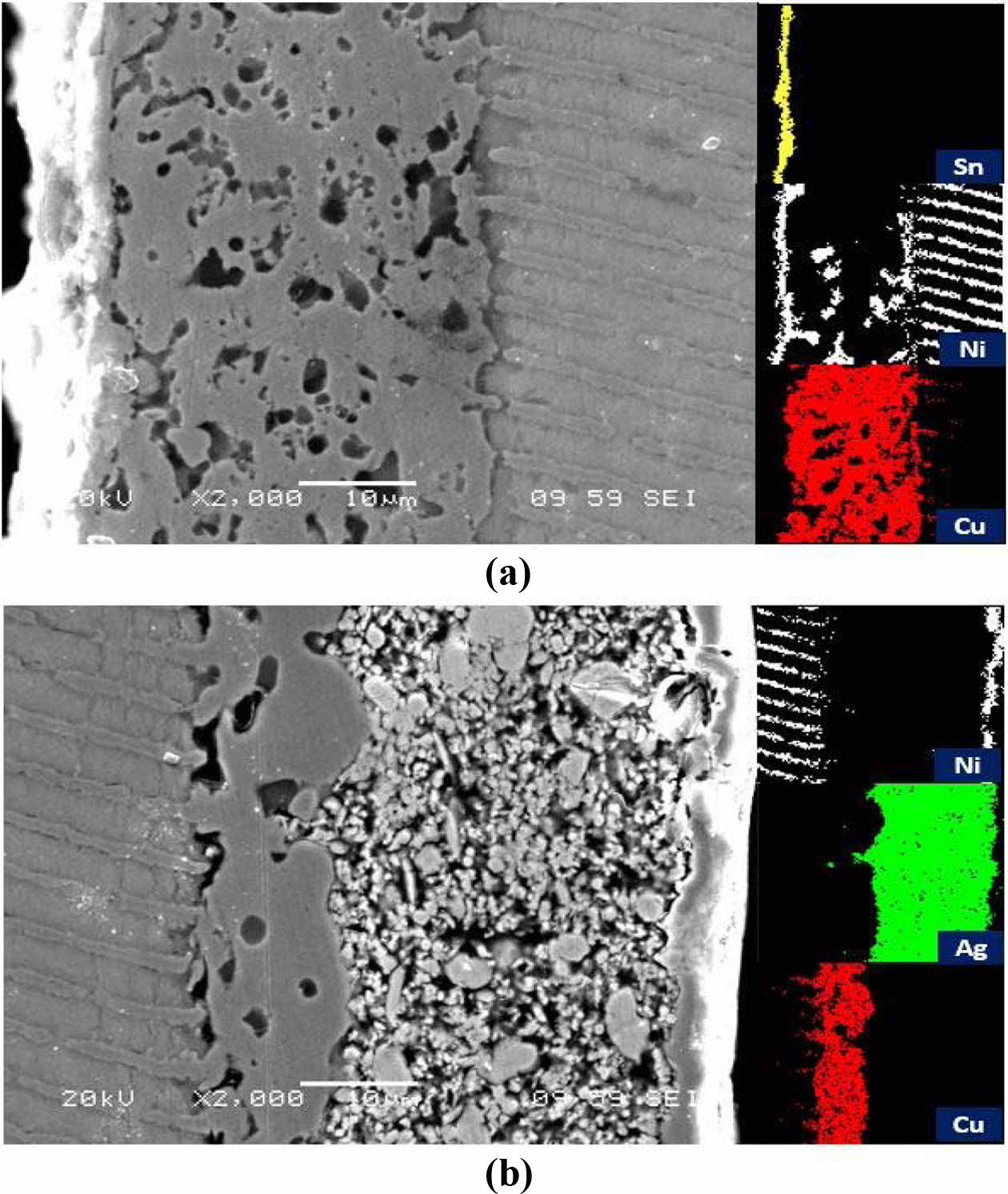 Fig. 10 SEM and EDS results after 500hours of THB test (a) Standard type MLCC of 1005 size (b) Soft-termination type MLCC of 1005 size. |