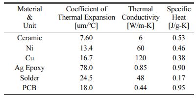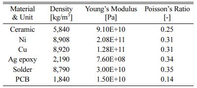 Board flex simulation was performed to determine the change in mechanical stress applied to the MLCC with Ag-epoxy electrode. The board flex simulation consisted of a structure in which the MLCC was mounted by soldering at the center of the PCB. The analysis was performed under the condition that a maximum bending displacement of 5 mm was maintained at the center for 5 s. The physical properties of the material used in the FEA simulation are shown in Table 1 [11-15]. The density, Young’s modulus, and Poisson’s ratio are required for stress analysis due to mechanical deformation.