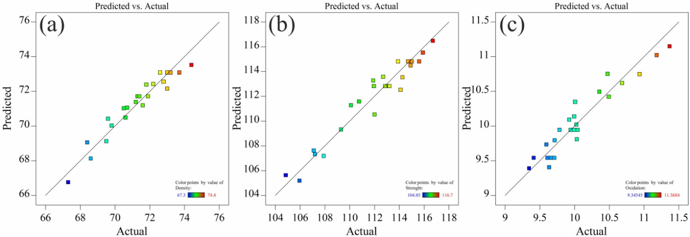 The Model F-values of 44.90, 58.92 and 35.52 for density, modulus of rupture and oxidation layer, respectively, imply that the models are significant. P-values less than 0.001 indicate that there is only a 0.01% chance that a F-value this large could occur due to noise. The lack of fit F-value of 2.36, 2.60 and 2.90 imply that there are 15.00%, 12.50% and 10.04% chance that a lack of fit F-value could occur due to noise for density, modulus of rupture and oxidation layer, respectively. Fit statistics are shown in Tables 7-9. Table 8