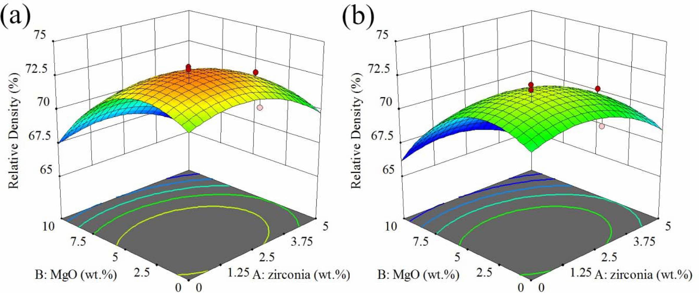 The response surface and contour diagram for the relative density of AMZG refractory composites as a function of t-zirconia and MgO content (wt.%) is presented in Fig. 2.