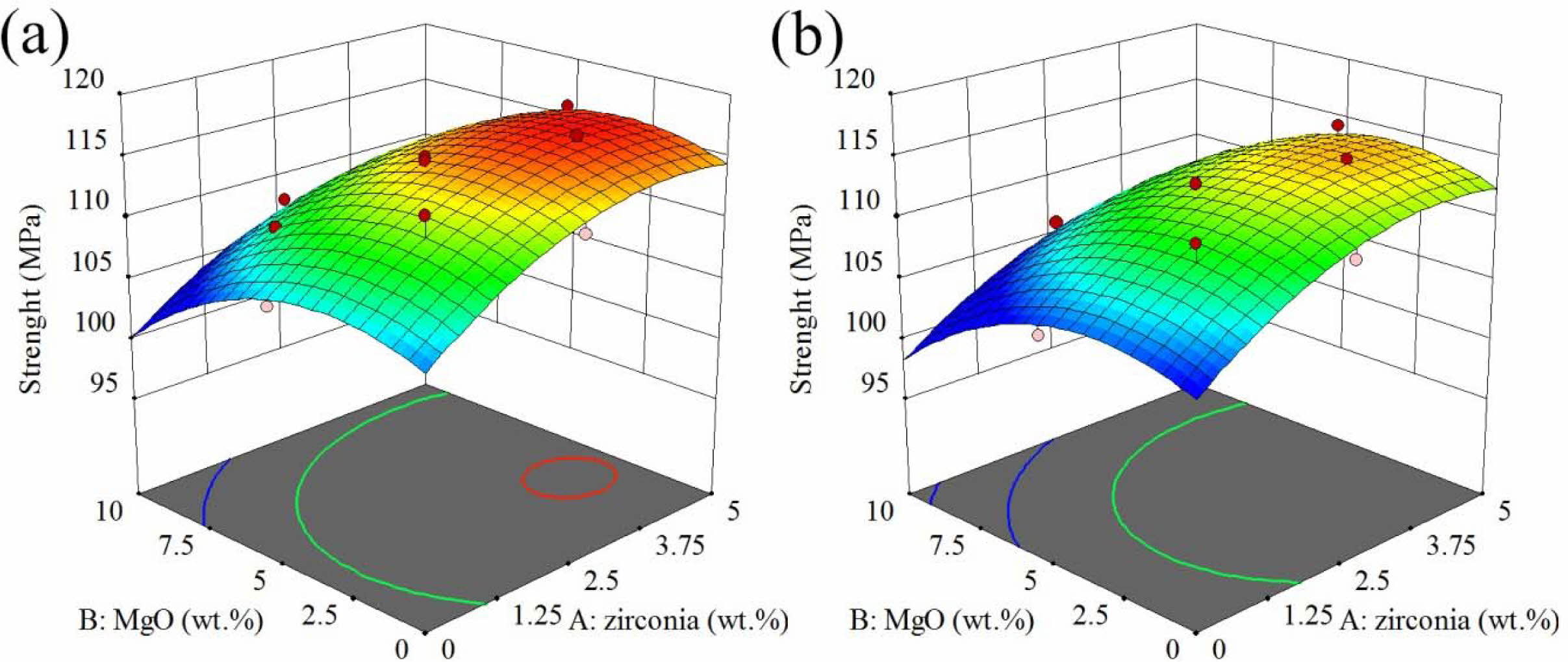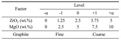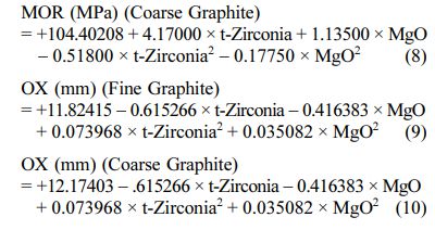 where Y is the response; b0 is the model constant, bi is the linear coefficients, bii the quadratic coefficients and bij is the interaction coefficients, xi and xj are indepen- dent variables. There were five levels for numeric factors (ZrO2 and MgO) and two levels for categoric factor (graphite).