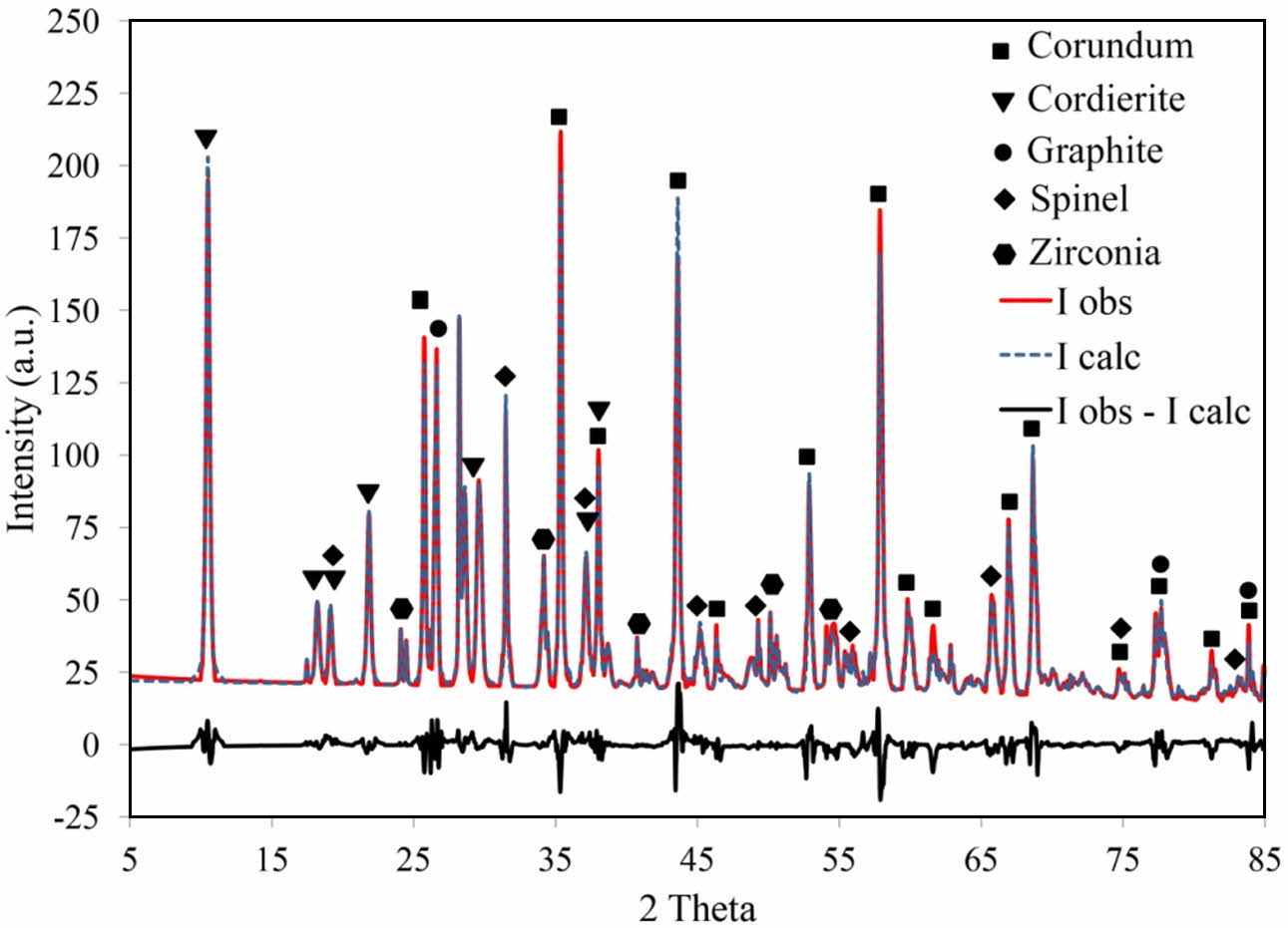 As shown in Fig. 5, the detected phases were corundum (JCPDS card No. 96-900-9675), cordierite (JCPDS card No. 96-900-5807), spinel (JCPDS card No. 96-900-2850), zirconium oxide (JCPDS card No. 96-230-0297) and graphite (JCPDS card No. 96-110-0004). The amount of corundum, cordierite, spinel, zirconium oxide and graphite is 44.2, 26.1, 10.3, 4.2 ad 15.2 wt.%, respectively. The above values were obtained with the aid of the Rietveld method, carried out until the goodness of fit values (GOF) reached about 0.19, which is considered a satisfactory value to reveal the real phase composition. Different plots produced by refinement using the Rietveld method also reveal a reasonable fit between the observed and the calculated plot, demonstrating the usefulness of the method for calculating the quantity of phase composition in the process. Although silicon carbide formation is thermodynamically feasible (Table 10), it is not detected in XRD pattern, meaning that silicon carbide was not formed or its amount is neglectable. The formation temperatures of the phases and the inter- actions occur is discussed in more detail considering the results obtained by DTA analysis.