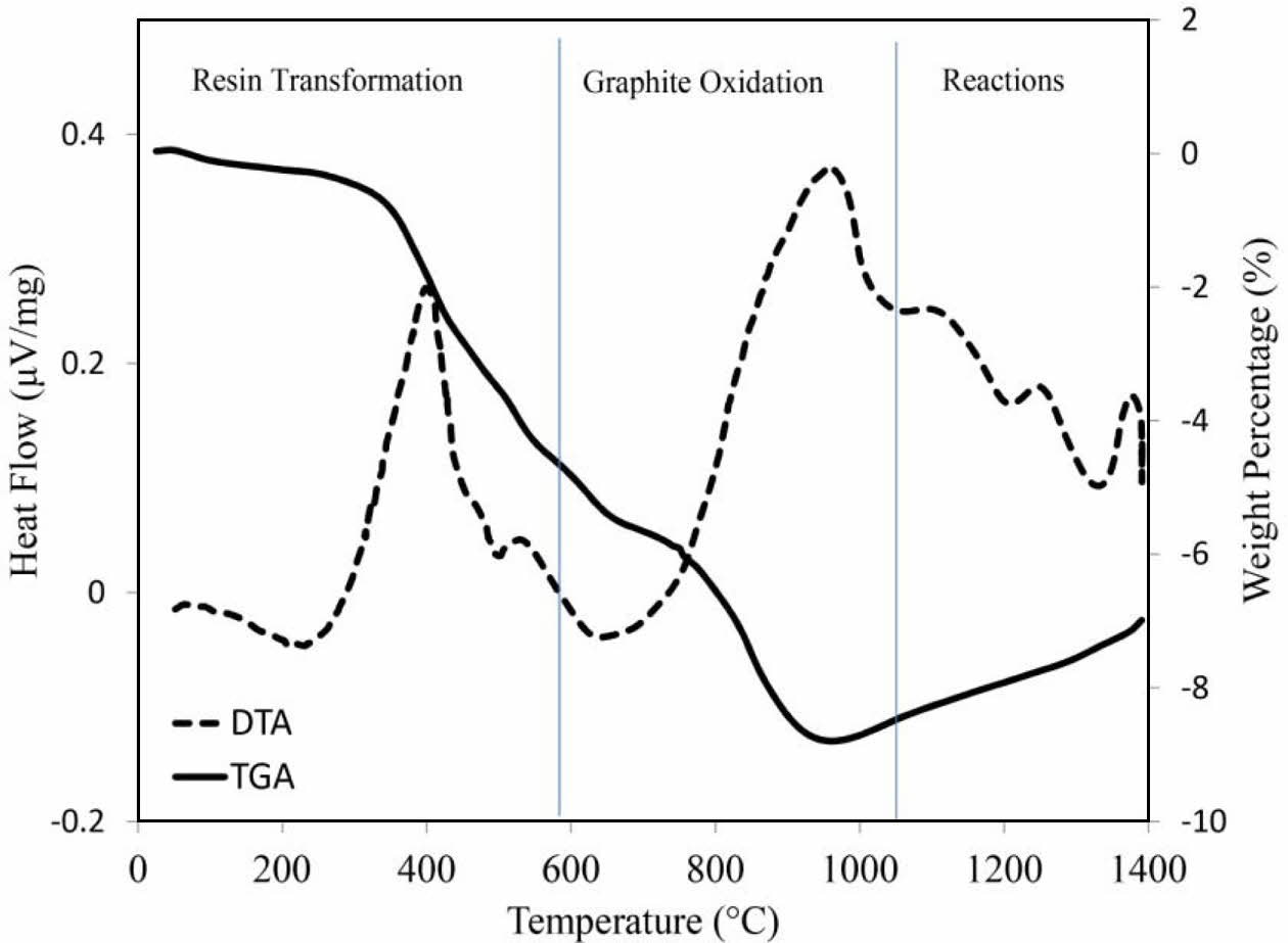 Fig. 6 shows simultaneous thermal analysis (STA) of the optimum sample. The DTA graph shows exothermic peaks below 600 oC that are attributed to the pyrolysis of resin and the oxidation of residual carbon [37]. This event is associated with a weight loss of about 5%. Oxidation of graphite occurs at around 1000 oC, which is accompanied by 4% weight loss. The exothermic peak above 1000 oC is characteristic of spinel formation [38], while the exothermic peaks above 1200 oC and below 1400 oC are due to the solid state formation of μ and α cordierite, respectively [39]. As can be seen, STA analysis result is in good agreement with X-ray diffraction pattern.