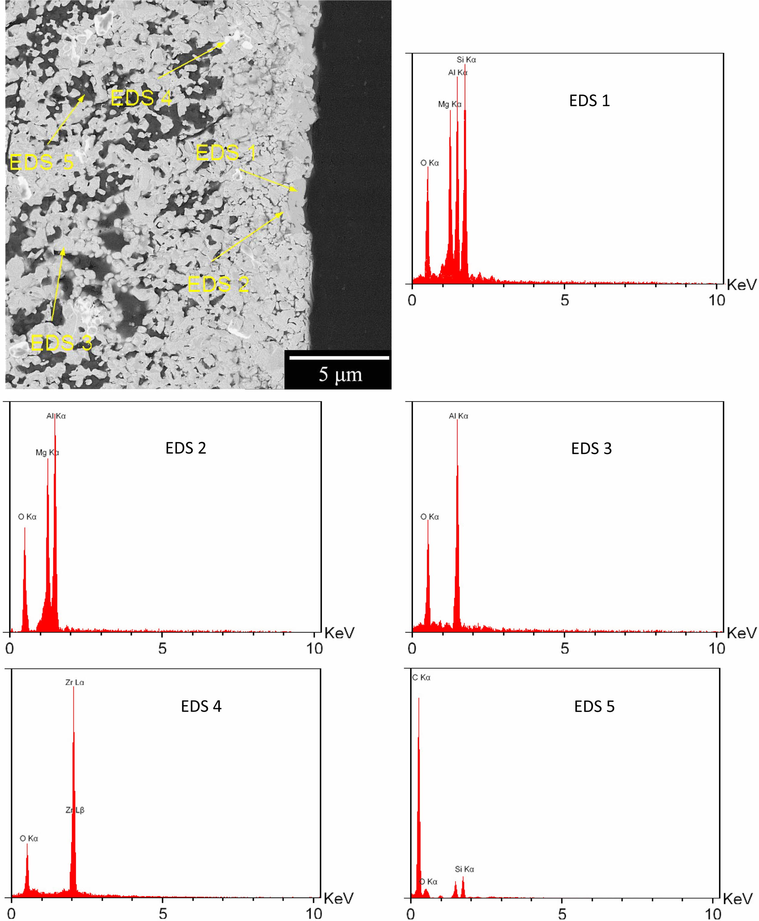 The atomic number sensitivity of BSE mode can be exploited to distinguish the particles [40]. In Fig. 8, the brighter particles represent zirconia (EDX 4) and the darker particles are graphite (EDX 5), but alumina, magnesia and silica are not discernible. As can be seen, no graphite is observed near the surface and the almost dense cordierite phase is formed (EDX 1), which is due to the interaction of cristobalite at the surface and MgAl2O4 spinel (EDX 2) [35].