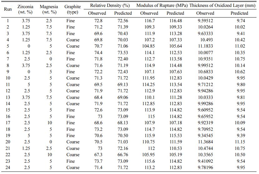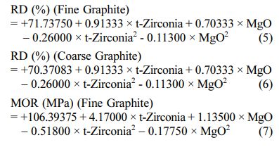 Based on the numerical optimization, the best result is at t-zirconia of 3.267 wt.%, MgO of 4.101 wt.% and for using fine grained graphite. The predicted point has relative density of 72.93%, modulus of rupture of 116.157 MPa and oxidation layer thickness of 9.486 mm, which its desirability is about 89%.